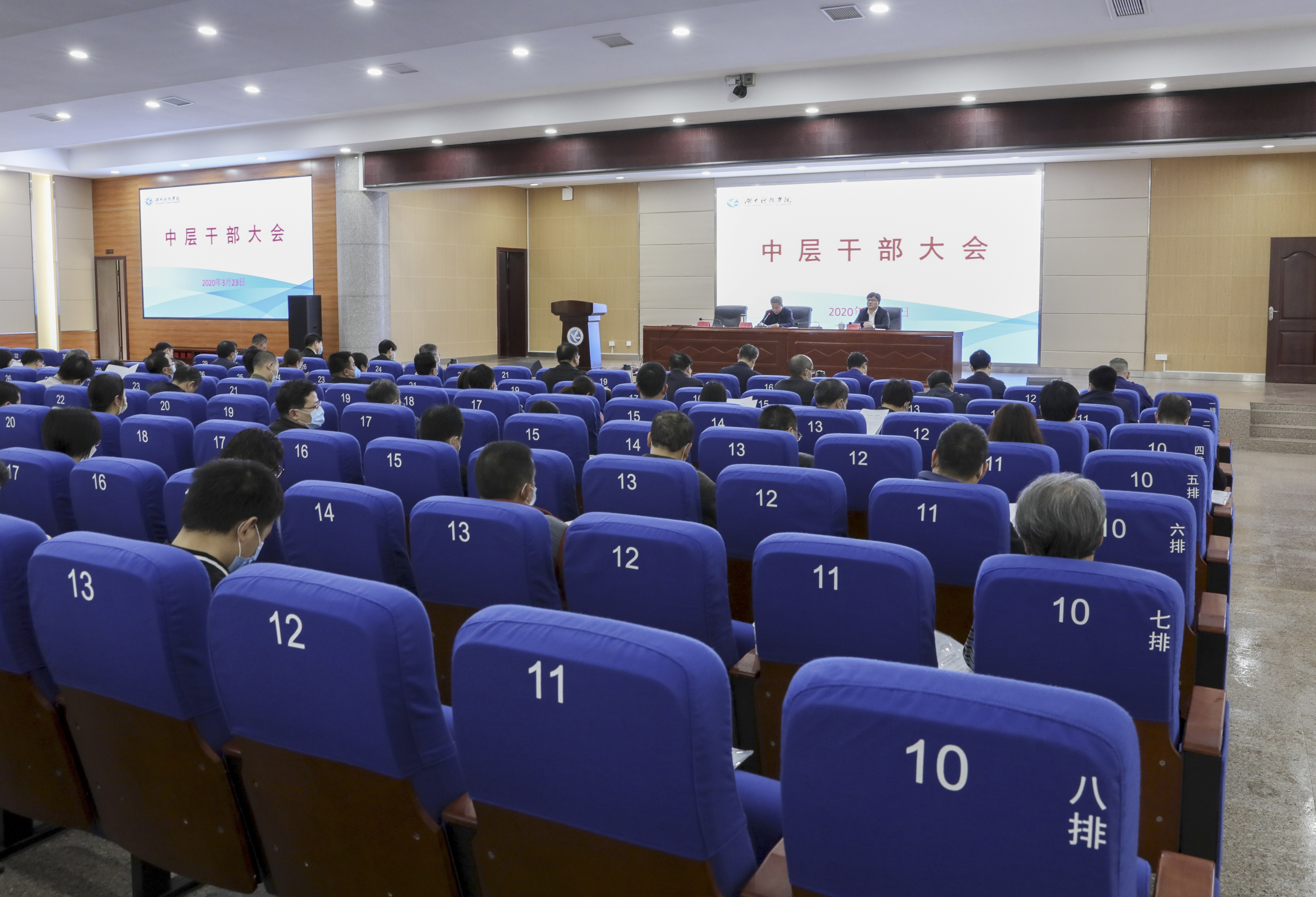 曾宝成指出,今年学校要着力抓好党的政治建设、疫情防控、“三全育人”综合改革、申硕、专业认证、校园信息化建设、80周年校庆筹备工作等重点工作任务,认真学习贯彻习近平总书记系列重要讲话精神,坚持不懈推进“两手抓”:一手抓疫情防控,一手抓教育教学,全力推进学校各项事业持续向好。他对全体中层干部提出五点要求:一是务必要与时俱进强学习。要真正学深悟透习近平新时代中国特色社会主义思想,把准中国教育发展的走向脉络,科学制定学校发展规划和目标定位。二是务必要围绕中心谋大局。要把围绕中心、服务大局作为基本要求,找准工作切入点和着力点,做到因势而谋、应势而动、顺势而为。三是务必要同心同德促发展。要做到思想同心、目标同向、行动同步,把思想统一到学校决策部署上来,统一到内涵发展、特色发展上来,助推学校建设特色鲜明的地方性高水平应用型大学。四是务必要脚踏实地抓落实。要争当“思想家”、“改革家”、“实干家”,切实将责任扛在肩上,将任务落到实处。五是务必要头脑清醒讲规矩。要强化底线思维,始终把纪律和规矩挺在前面,带头树牢“四个意识”,坚定“四个自信”,坚决做到“两个维护”,做政治上的明白人、工作中的行动派。