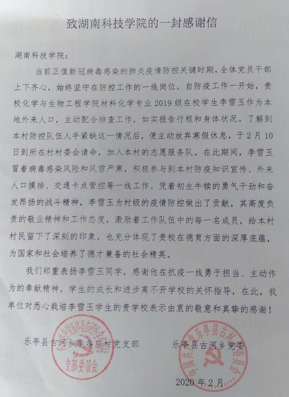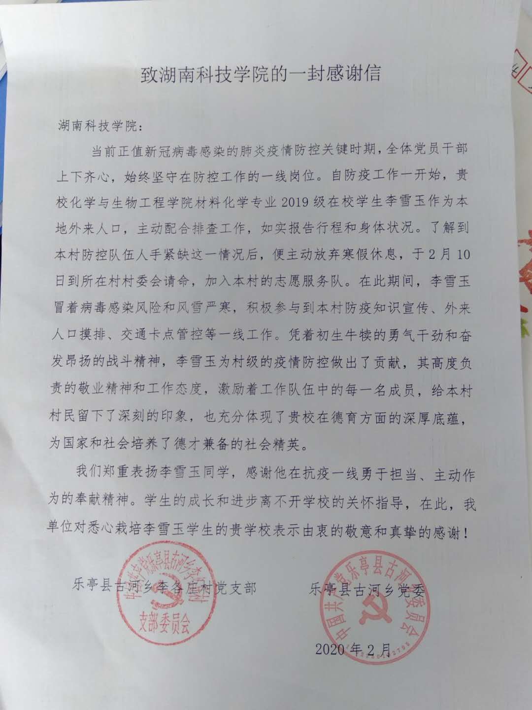 本网讯 日前,伟德官网收到唐山市乐亭县古河乡党委发来的一封感谢信,感谢伟德官网化学与生物工程学院材料化学专业2019级李雪玉同学,勇担使命、担当尽责,为家乡联防联控工作做出积极贡献,让青春在战“疫”中绽放。