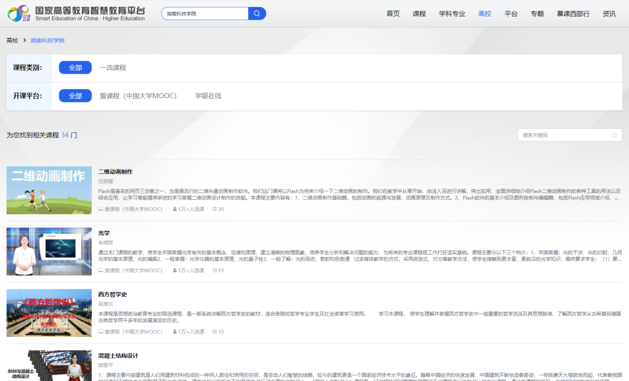 本网讯(通讯员 代军垒 郭宜娟)近日,国家高等教育智慧教育平台正式上线,在首批上线的课程中,伟德官网有34门优质课程入选,覆盖了伟德官网8个学科34个专业类。在湖南省入选的32所地方高校中,伟德官网入选课程门数数量排名第九,除大学外,学院高校入选门数数量排名第一。