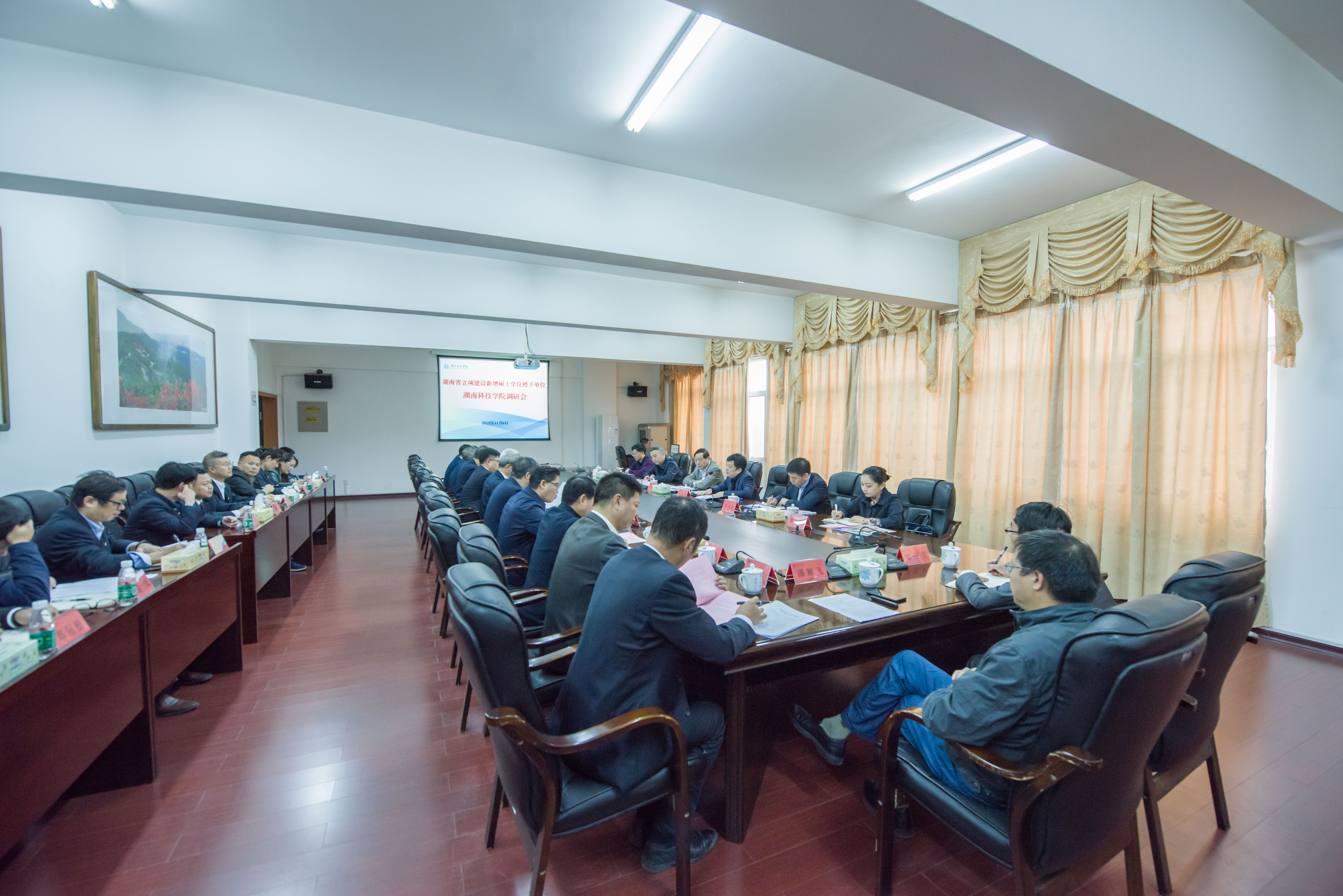 本网讯 11月6日上午,以南华大学原党委书记邹树梁为组长的湖南省立项建设新增硕士学位授予单位调研组一行6人来校调研。省教育厅学位管理与研究生教育处副处长唐利斌,党委书记曾宝成,校长李钢,全体校领导、党委委员,党政办、人事处、教务处、科技处、发展规划与学科建设处、计划财务处、资产管理处、国际交流与合作处、团委、图书馆、实验实训中心、就业与创业指导中心等职能部门负责人,相关建设学位点负责人参加座谈会。会议由唐利斌主持。