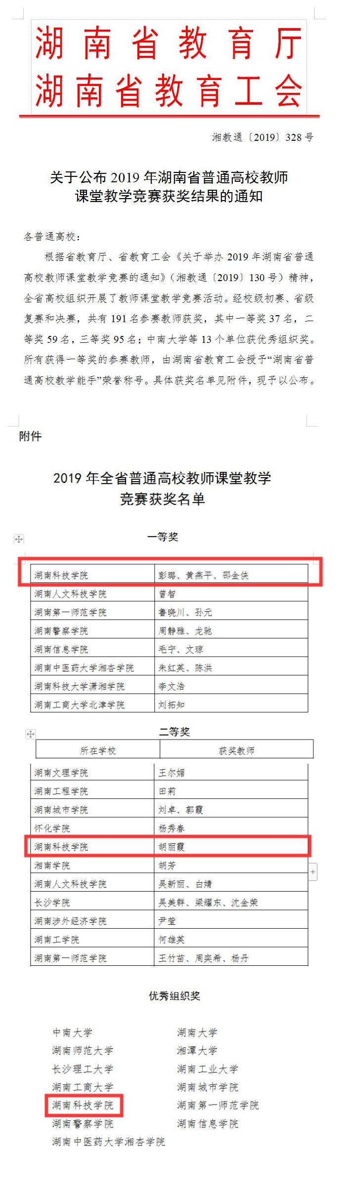 本网讯10月25至26日,由湖南省教育厅、湖南省教育工会主办的2019年湖南省高校教师课堂教学竞赛在湖南工商大学举行,伟德官网教师荣获一等奖3个,并获“优秀组织奖”。