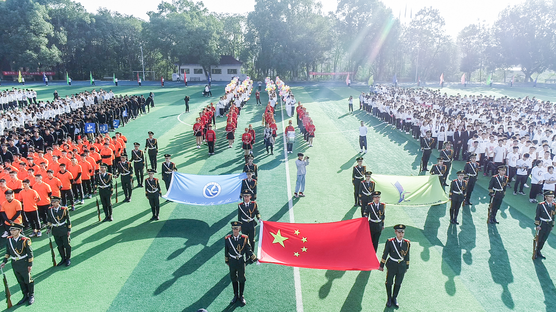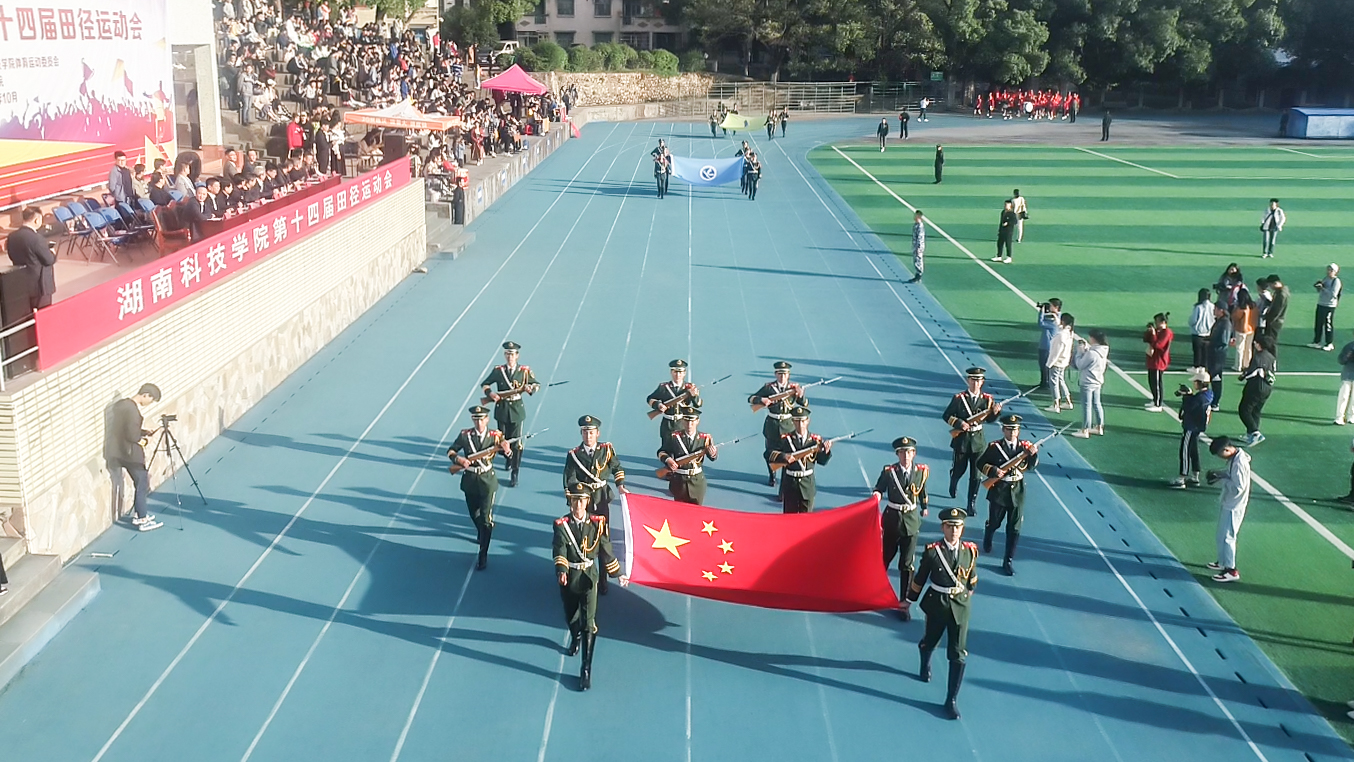 音符飘扬振人心,步履铿锵显豪情。在庄严的乐声中,国旗方阵、校旗方阵、会旗方阵、各文艺方阵、裁判员方阵以及各学院代表队依次入场。由音乐与舞蹈学院学生组成的乐队方阵着统一礼服礼帽,长笛、鼓、萨克斯等多种乐器齐声奏响运动会的序章;鲜花队方阵由外国语学院56名学生手捧鲜花组成,56束鲜花象征着56个中华民族,挥动的花束彰显民族融合与包容;传媒学院方阵高举摄像机和相机,用快门传递独特风采……23个方阵一一经过主席台前,队员们昂首阔步,动作整齐,口号嘹亮,尽情展现科院学子积极向上的精神风貌。