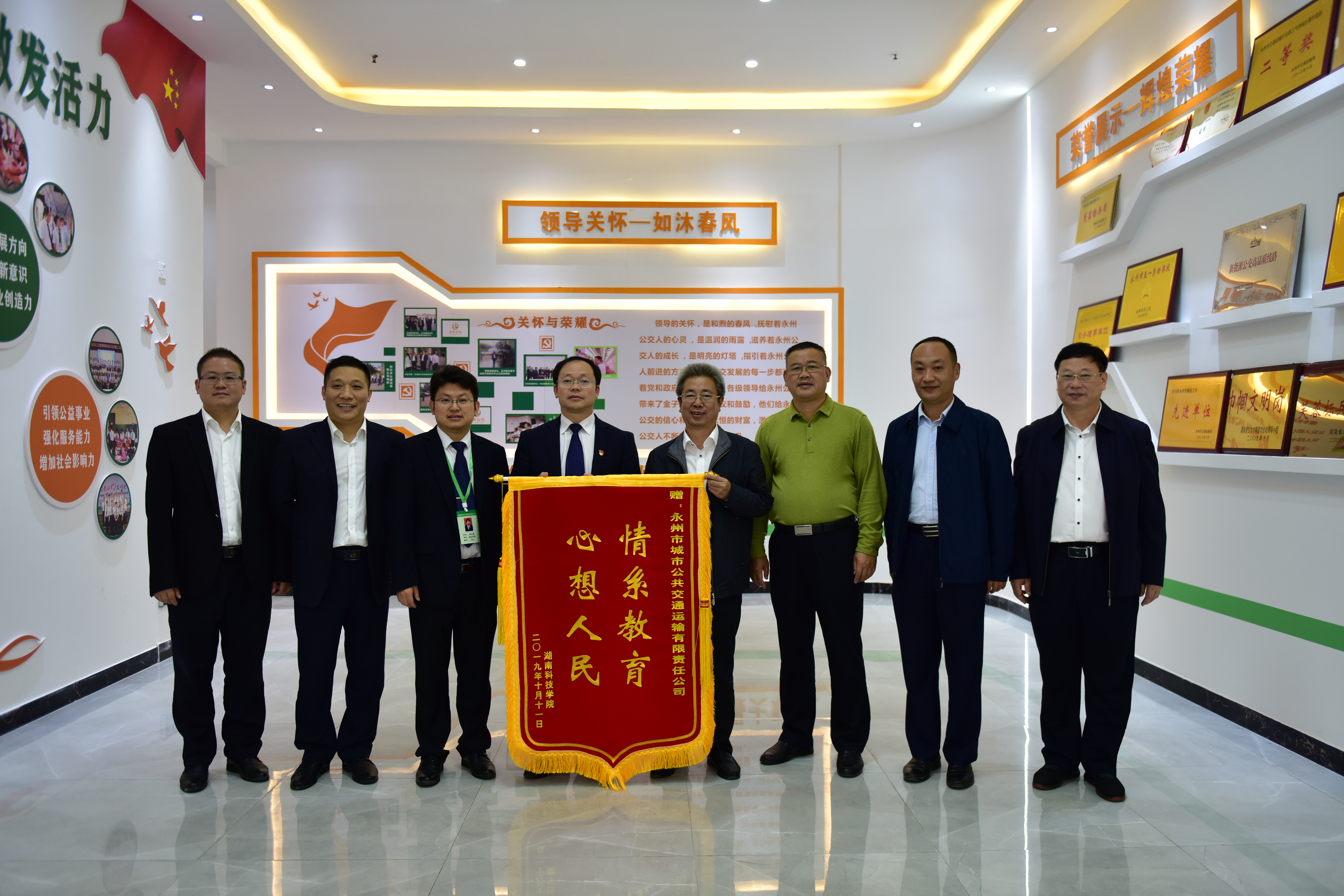 本网讯 10月15日,党委书记曾宝成前往永州市公交公司,把一面绣有“情系教育 心想人民”的锦旗送到该公司党委副书记、总经理蒋俊手中,感谢该公司今年8月开通伟德国际1946源于英国至永州火车站303路公交车,为师生出行提供便利。党委委员、组织部长何福林,党委委员、宣传部长杨涛,学工部长唐华山参加赠旗仪式。