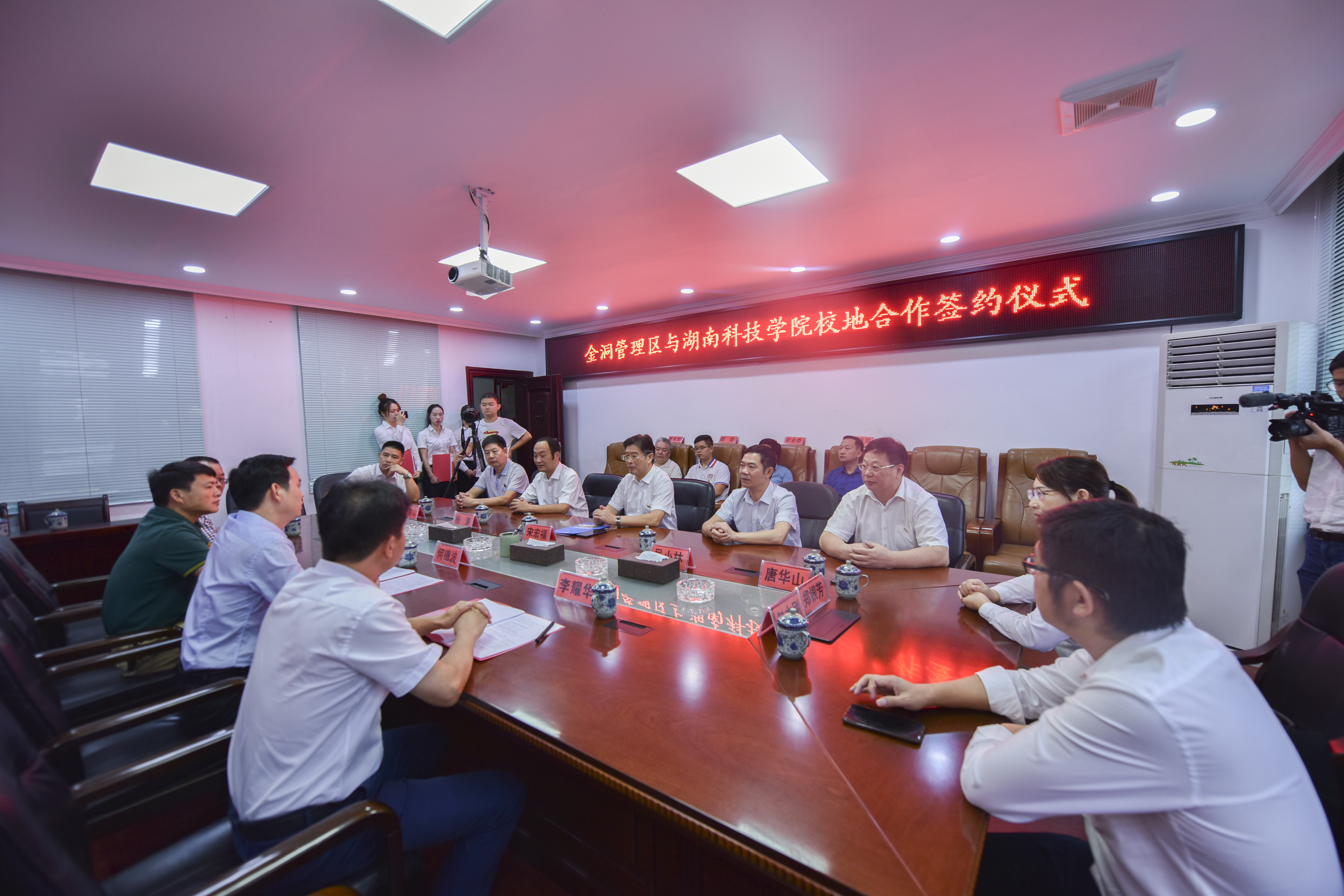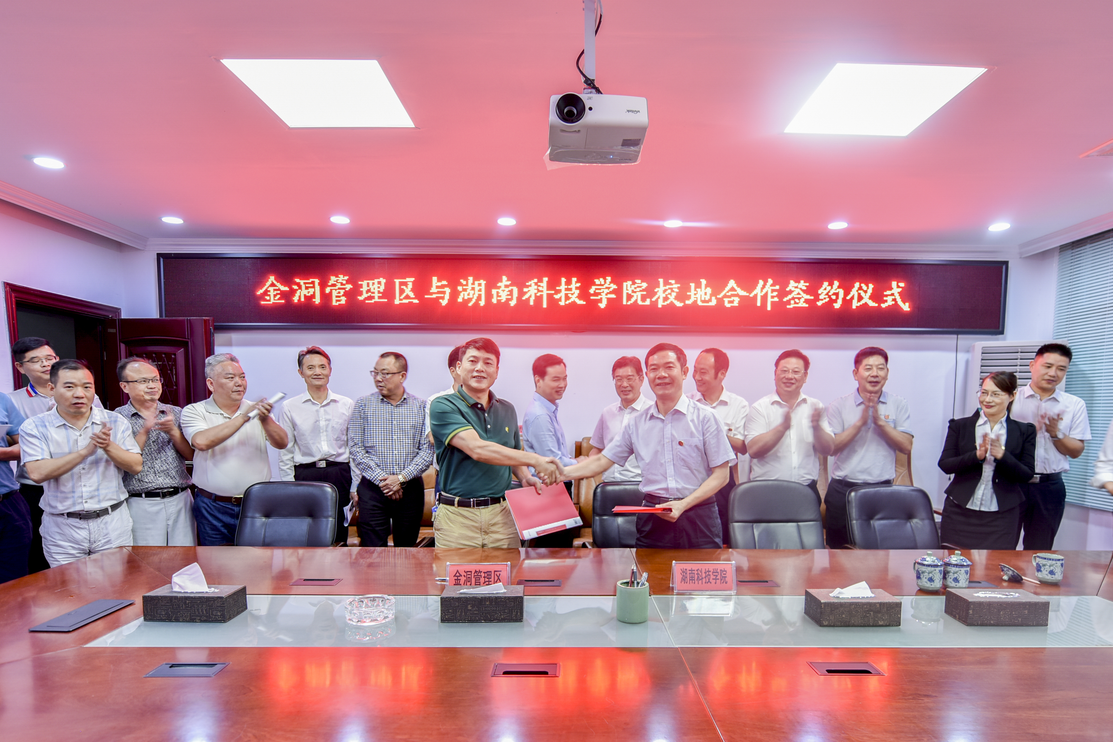 本网讯 9月26日晚,学校与金洞管理区举行框架合作协议签约仪式,副校长宋宏福、吴小林,金洞管理区党委书记何德波,金洞管理区党委副书记、管委会主任何永明,宣传部、学工部、科技处、校友办、创新创业学院、音乐与舞蹈学院等相关部门负责人参加。
