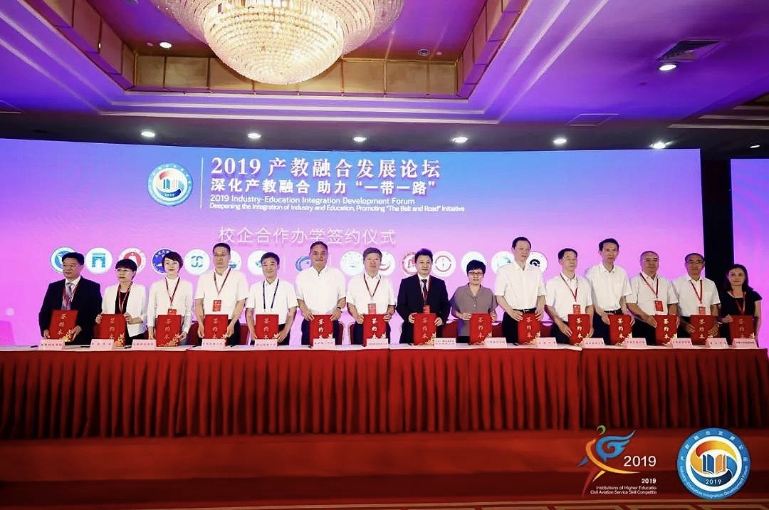 本网讯 7月19日,由中国高等教育学会指导,中国高等教育学会产教融合研究分会、中国教育电视台主办,中国教育报、中国民航报等协办,北京广慧金通教育科技有限公司承办的“深化产教融合 助力‘一带一路’”2019产教融合发展论坛在河北廊坊召开,来自教育界、国家民委、民航系统、全国400余所高校党委书记、校长等领导,海外40余位国家大学校长和驻华使节,以及200余家航空公司、机场集团、企事业单位领导和嘉宾共计700余人齐聚一堂,共商新时代产教融合发展。伟德官网副校长宋宏福带领教务处、传媒学院、旅游与文化产业学院等部门和学院负责人参加,并代表学校与北京广慧金通教育科技有限公司签订校企合作协议。