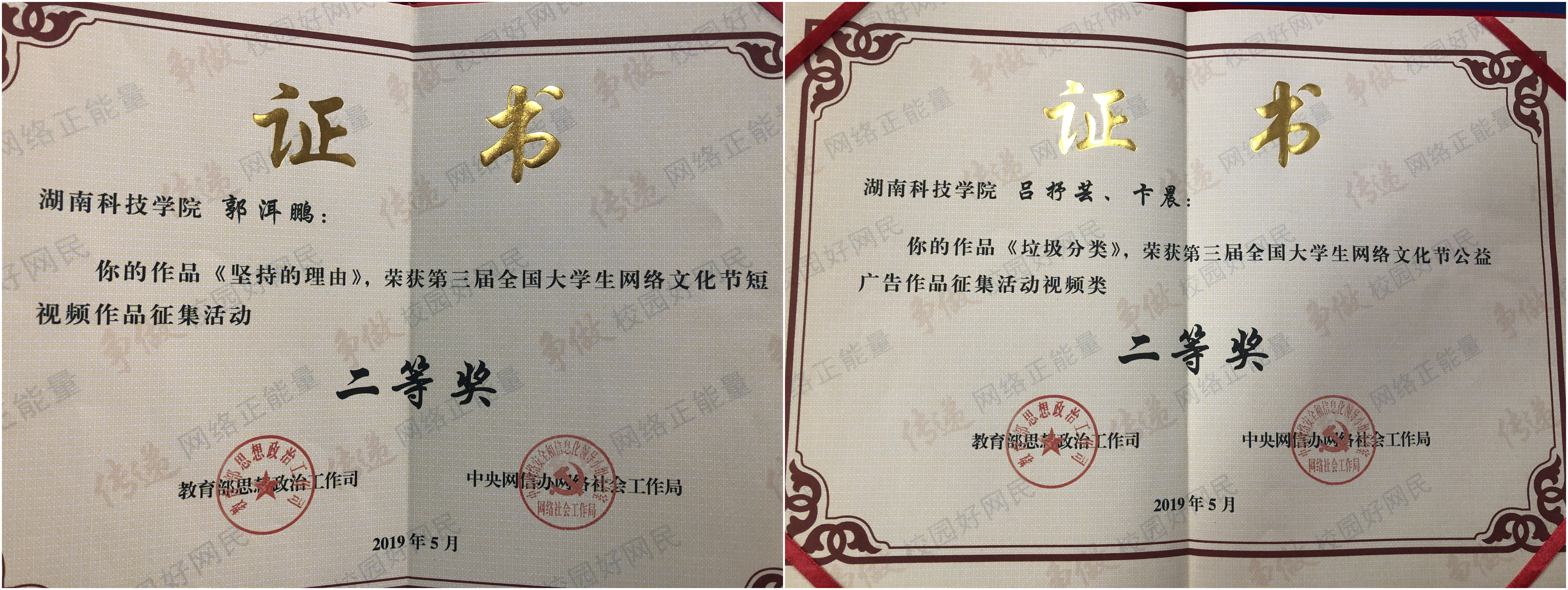 本网讯 近日,由教育部思想政治工作司、中央网信办网络社会工作局主办的第三届“全国大学生网络文化节”和“全国高校网络教育优秀作品推选展示活动”评选结果公布,伟德官网传媒学院学生吕抒芸、卞晨创作的作品《垃圾分类》获公益广告类全国二等奖,郭洱鹏创作的作品《坚持的理由》获短视频类全国二等奖,龙婷和汪倩同学创作的作品《为祖国而歌》获音频类优秀奖。获奖作品分别由传媒学院周悦、唐华丽两位老师指导。