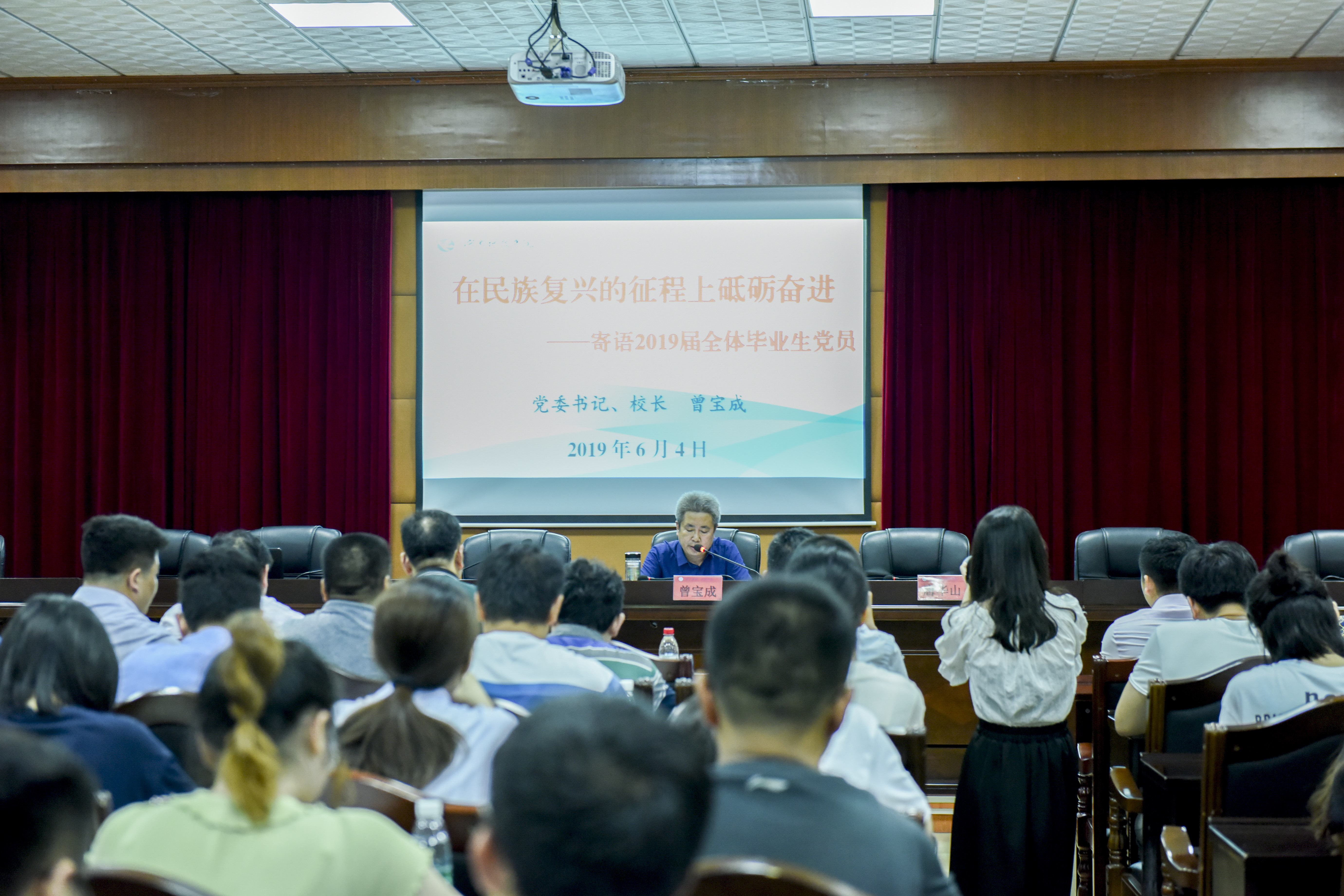 本网讯  6月4日晚,党委书记、校长曾宝成为即将离校的毕业生党员授党课,勉励全体毕业生党员坚定理想信念,提高党性修养,练就过硬本领,在中华民族伟大复兴的新征程上砥砺奋进。各教学学院党总支副书记、辅导员、学工部相关人员以及2019届毕业生党员参加。