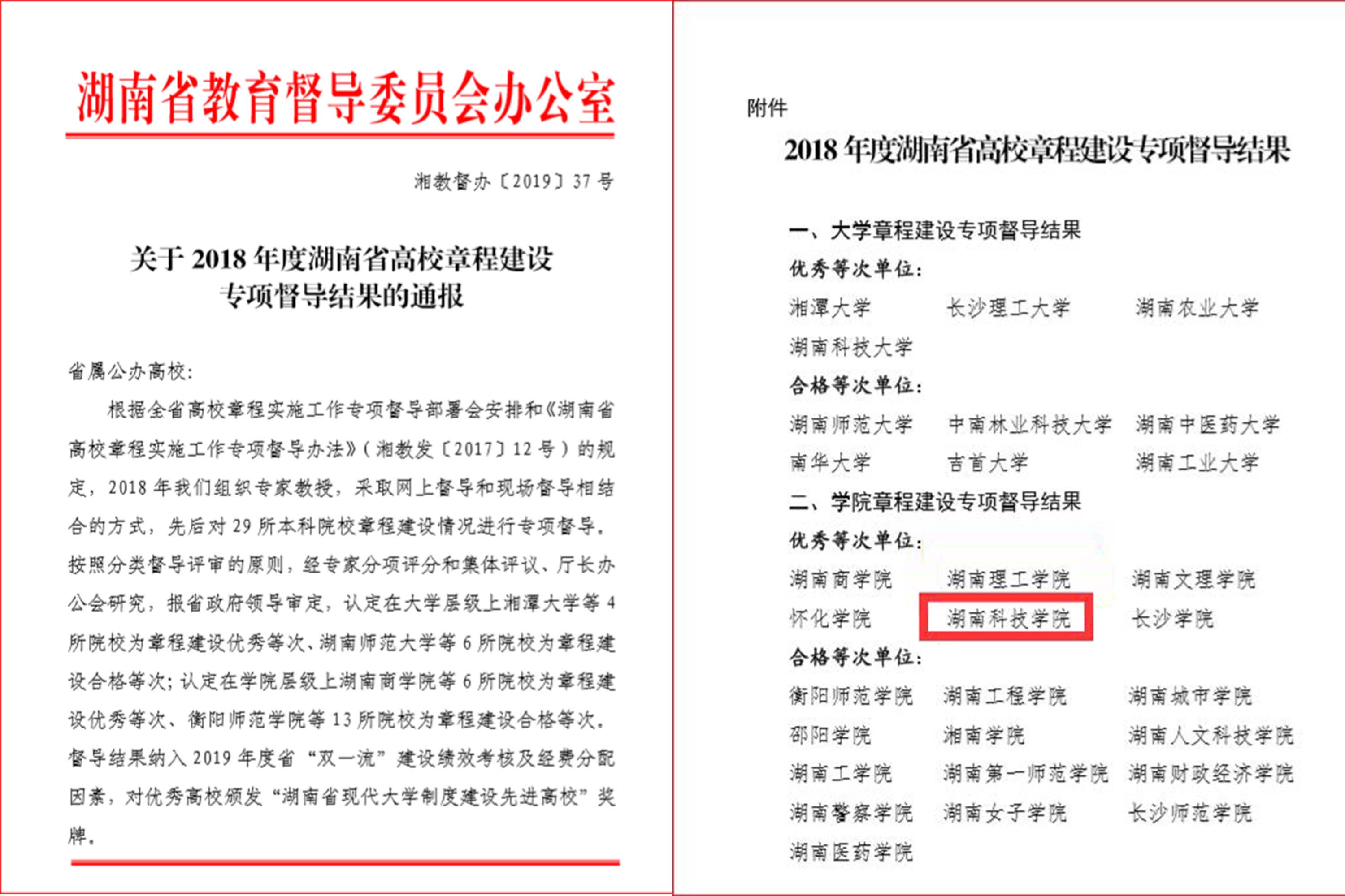 本网讯 近日,湖南省教育厅公布了高等学校章程建设专项督导结果,伟德官网被认定为章程建设“优秀”等次单位,被授予“湖南省现代大学制度建设先进高校”荣誉称号。