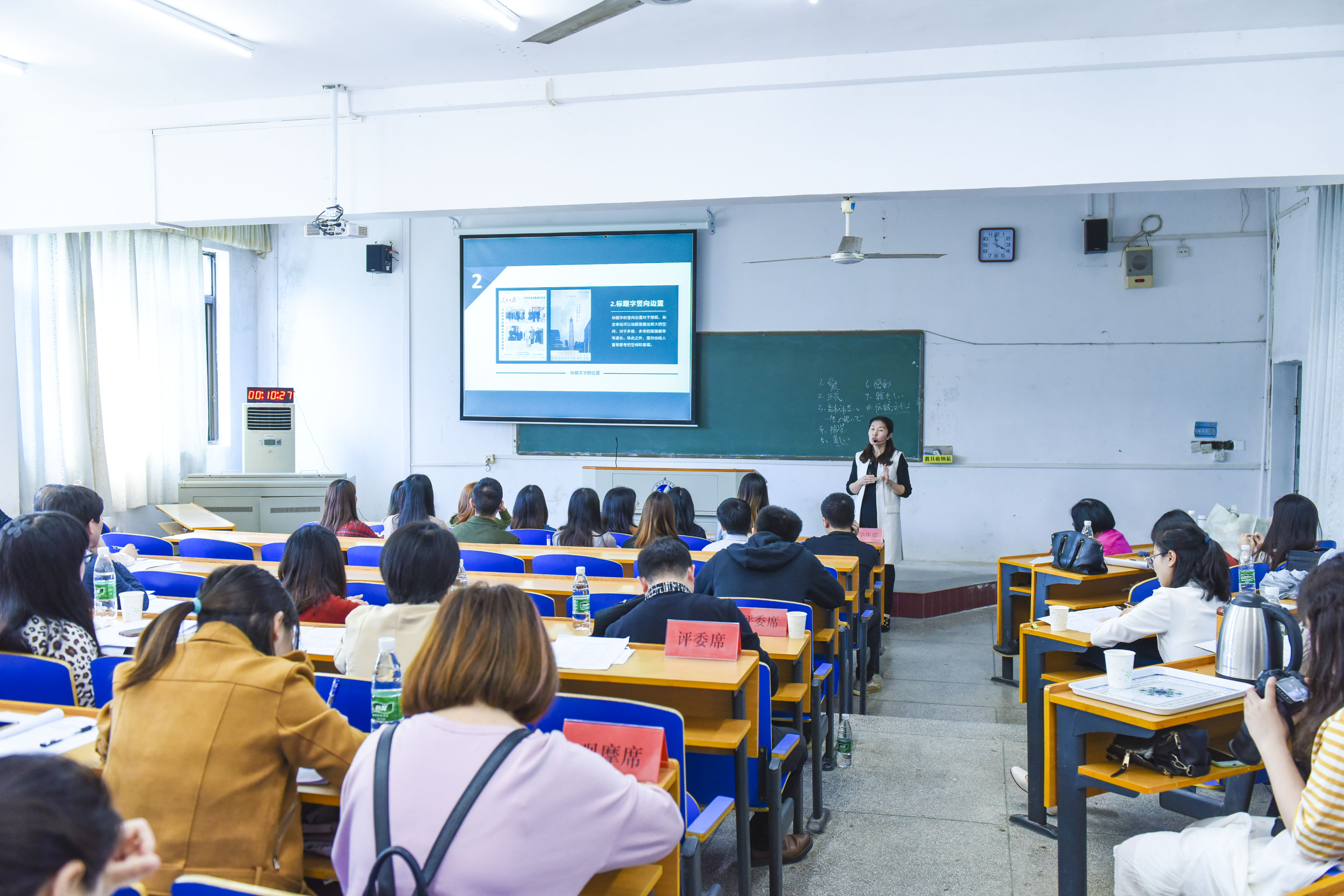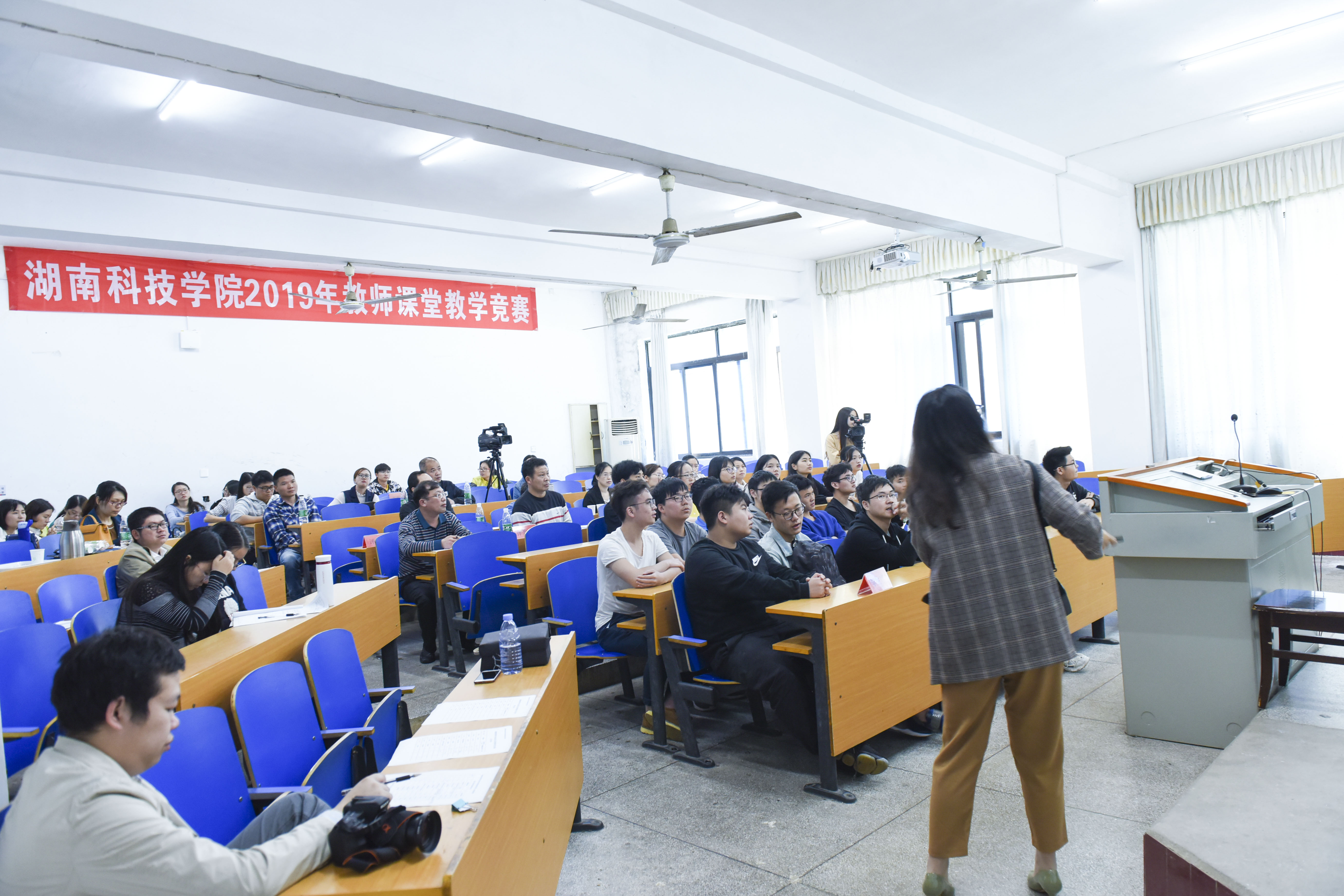 在比赛过程中,老师与学生积极互动,现场气氛十分热烈。电子与信息工程学院邵金侠老师以《通信原理》为主讲内容从基本场景(天气预报)应用出发,以通俗易懂的形式,展开基本差错控制思想的介绍和讨论,将通信和生活密切地联系在一起。理学院黄燕平老师以《弯曲程度问题和曲率》为主讲内容从生活中遇到的限速问题导入新课,给出了曲率的概念和计算方法,最后用西班牙火车脱轨事件说明要重视弯曲程度问题,在弯曲程度较大的路段一定要限速!外国语学院彭璐老师通过实例向学生普及日本传统婚礼仪式常识,两名学生现场为大家展示了日本最受年轻人欢迎的神前式婚礼特有的敬酒礼节。马克思主义学院杨艳姣老师以《人是万物之灵的奥秘》为主讲内容,用人类在飞机、载人潜水器、高铁等方面取得的成就为例,激发学生对人的主观能动性的深入思考。