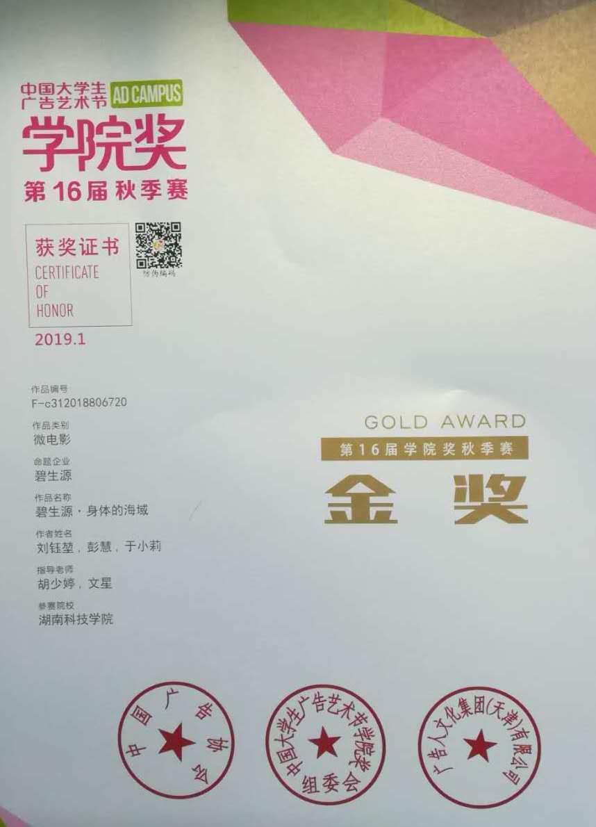 本网讯 1月10日,第16届中国大学生广告艺术节学院奖秋季赛创意盛典在北京梅地亚中心盛大举行。伟德官网传媒学院刘玉堃、彭慧和于小莉同学创作的作品《碧生源,身体的海域》,在20多万件竞赛作品中脱颖而出,获得本次大赛微电影类金奖。指导教师胡少婷和文星老师分别获“金牌指导教师”荣誉称号。这是伟德官网在这一赛事上的一大突破,也是本次大赛湖南省唯一获此奖项的高校。同时,传媒学院学子还获得优秀奖19项,佳作奖21项。