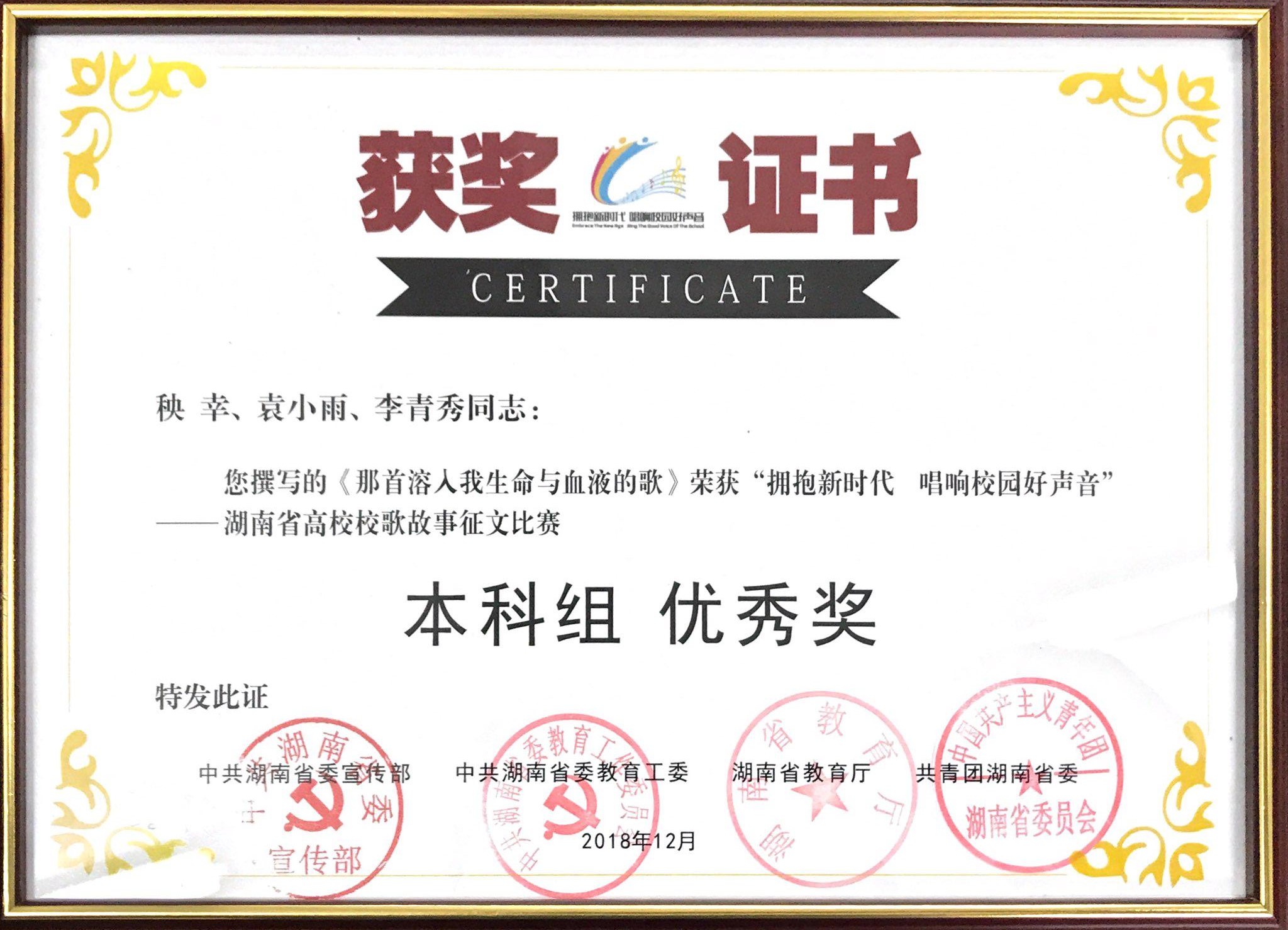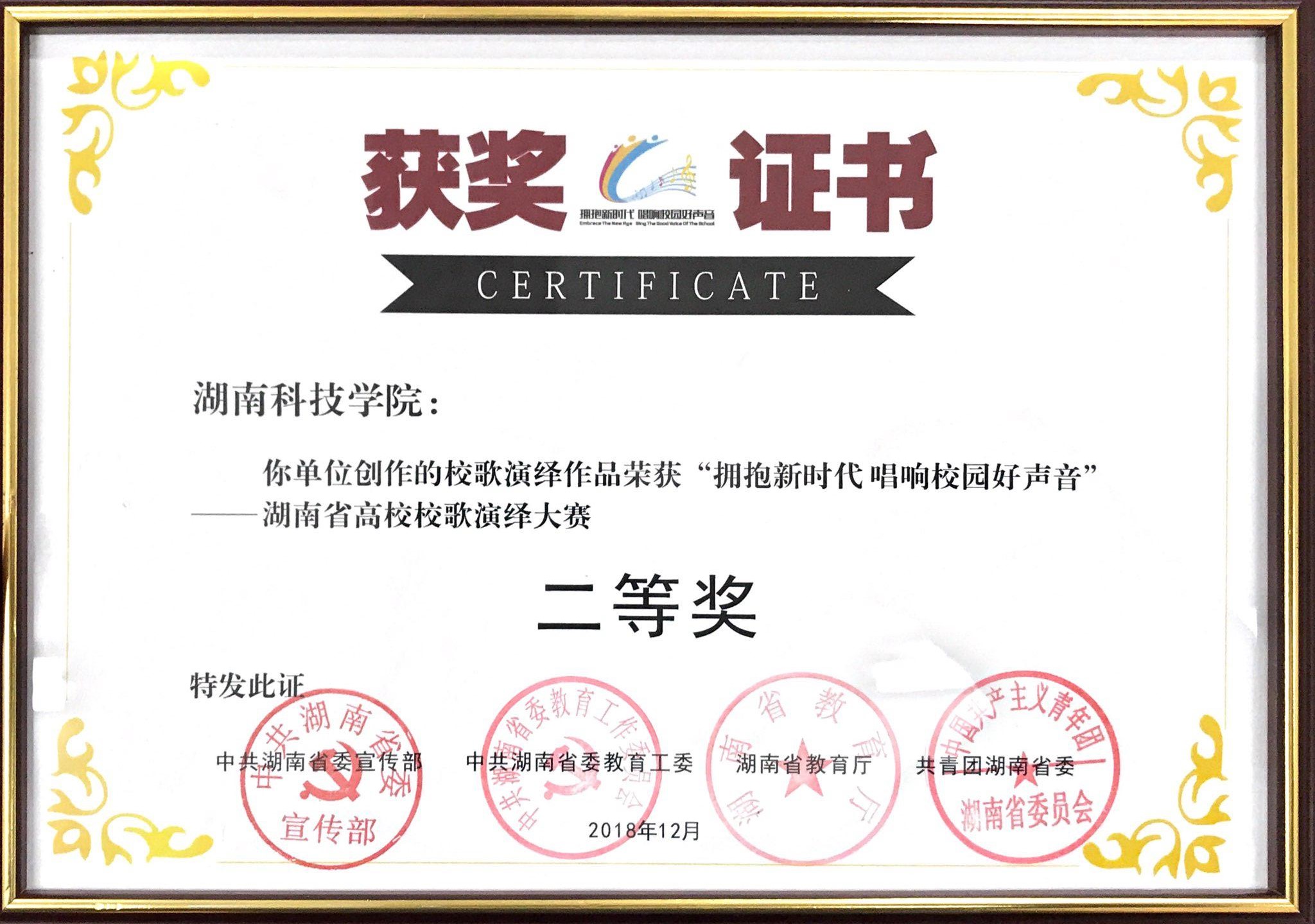 本网讯 12月28日下午,由中共湖南省委宣传部、中共湖南省委教育工委、湖南省教育厅、共青团湖南省委主办的湖南省第五届校园文化论坛暨全省高校校歌系列主题活动颁奖典礼在湖南教育电视台举办,伟德官网校歌《潇湘之歌》荣获校歌演绎二等奖,进入全省本科院校前八名,学生秧幸、袁小雨、李青秀作品《那首溶入我生命与血液的歌》获校歌故事征文优秀奖。副校长程智开出席颁奖典礼。
