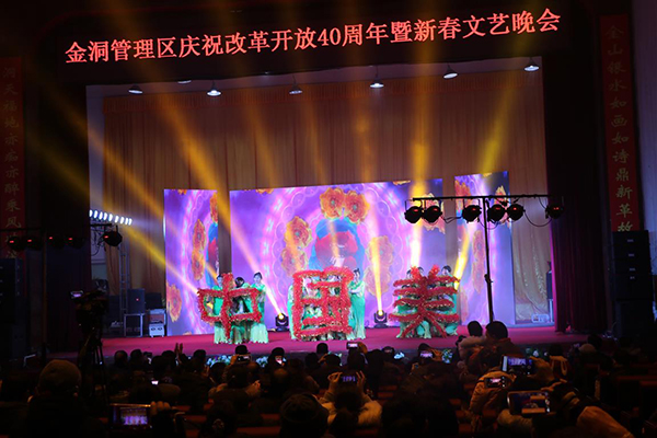 本网讯 1月3日,“奋进新时代,谱写新篇章——金洞管理区庆祝改革开放40周年暨新春文艺晚会”在金洞大会堂举行。活动由金洞管理区党委、管委会主办,由伟德官网党委宣传部、团委和金洞管理区党委宣传部、团区委承办,伟德官网人文与社会科学学院、音乐与舞蹈学院和金洞管理区妇联协办。学校副校长程智开,党委委员、宣传部长杨涛等到会观看演出。