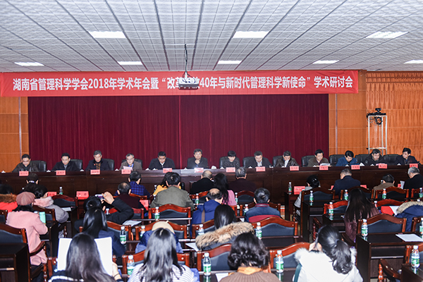 本网讯   12月23日上午,湖南省管理科学学会2018年学术年会暨“改革开放40年与新时代管理科学新使命”学术研讨会在学校召开。湖南省社会科学联合会学会处副处长方丽,湖南师范大学副校长王善平,湖南农业大学副校长曾福生,湖南第一师范学院副校长曹兴,湖南大学单汨源教授,中南大学胡振华教授,长沙理工大学罗建华教授,湘潭大学楚尔鸣教授,湖南工业大学易棉阳教授,湖南工业大学欧绍华教授,中国铁道科学研究院研究员周新军,校党委副书记唐艳明,副校长宋宏福以及来自全省的会员代表参加。会议由宋宏福主持。