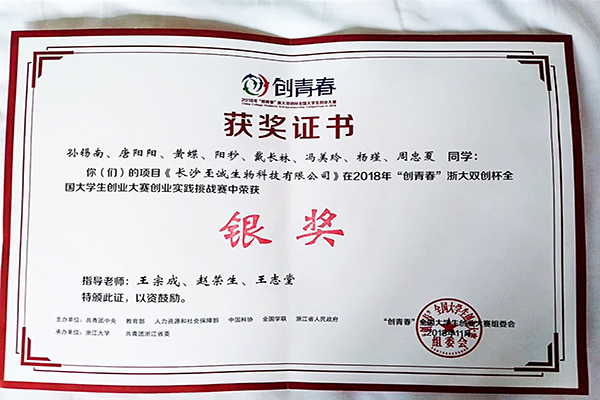 本网讯 11月3日,由共青团中央、教育部、人力资源和社会保障部、中国科协、全国学联、浙江省政府主办,浙江大学、浙江团省委承办的2018年“创青春”浙大双创杯全国大学生创业大赛决赛落下帷幕。经过多轮比拼,伟德官网由王宗成、赵荣生、王志堂老师指导,孙锡南、冯美玲等同学的作品《长沙至诚生物科技有限公司》喜获创业实践赛银奖,湖南省在此次大赛中斩获2金9银33铜,伟德官网成为全省夺银的两所二本院校之一。