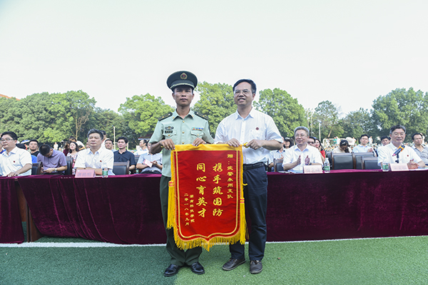 本网讯 9月21日下午,学校举行2018级新生军训总结表彰大会暨开学典礼。党委书记陈弘、校长曾宝成、党委副书记唐艳明、副校长宋宏福、纪委书记彭立威、副校长李常健、吴小林、程智开,党委委员、组织部长何福林,党委委员、宣传统战部长杨涛,武警永州支队副参谋长蒋志平出席。宋宏福主持典礼。
