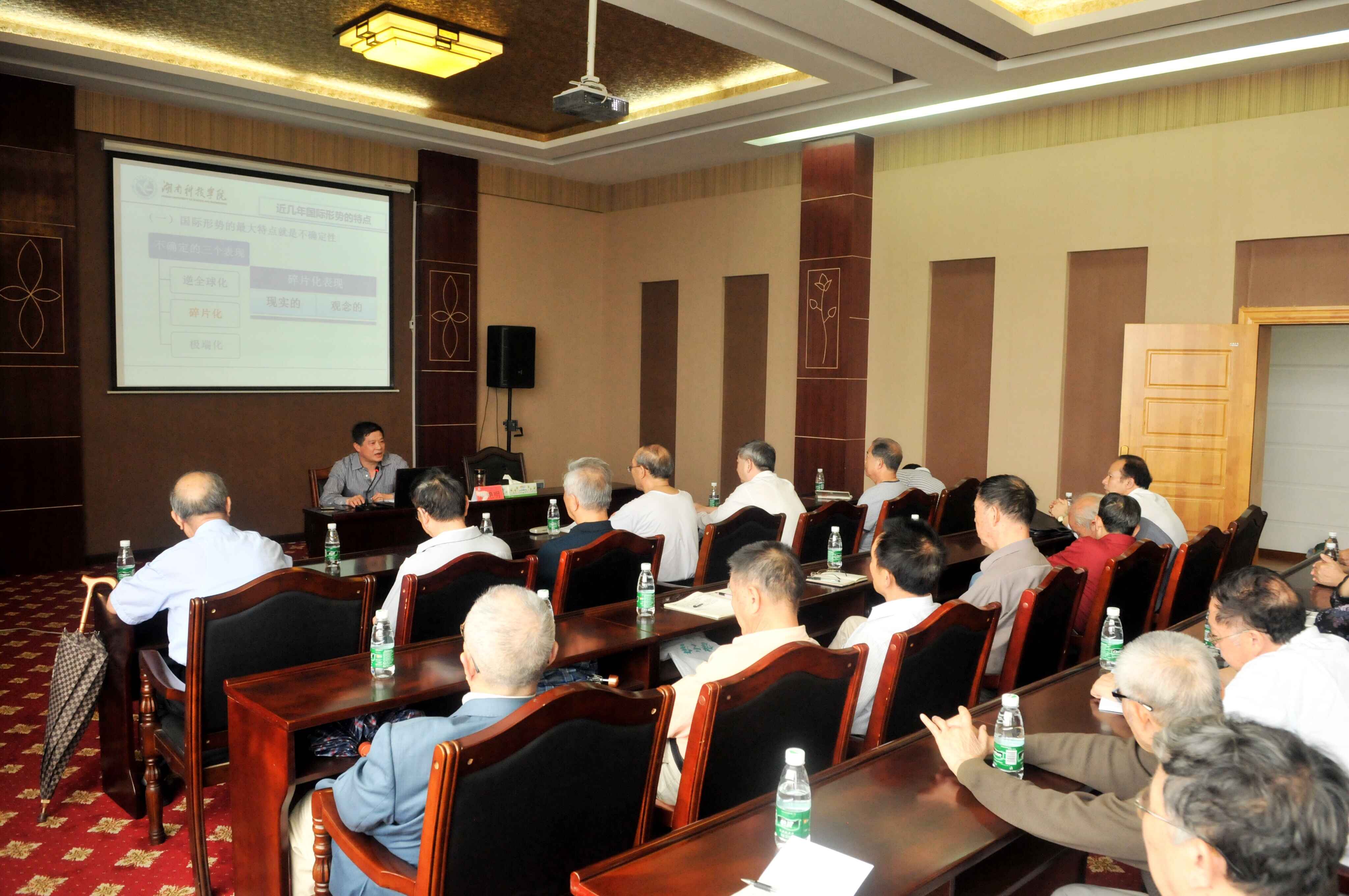 本网讯 为深入学习贯彻习近平新时代中国特色社会主义思想和十九大精神,6月6日下午,党委副书记唐艳明以“当前国际形势的特点和十九大以后的中国外交关系”为题,为伟德官网离退休同志作形势辅导报告。报告会由离退休工作处处长刘剑非主持,50余名离退休同志参加会议。