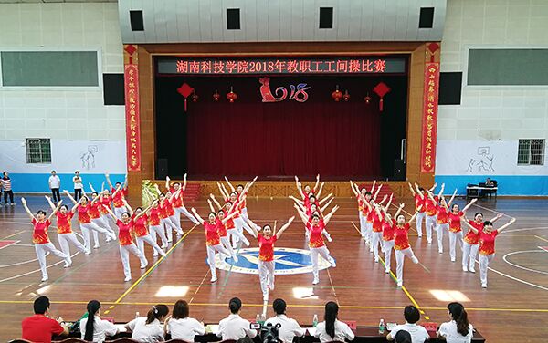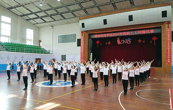 本网讯  5月18日下午,第一届教职工工间操比赛在体育馆火热举行。校长曾宝成及校领导唐艳明、郑山明、李常健、吴小林、程智开参赛或观赛。