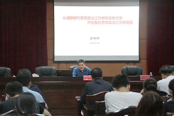 唐艳明以“认清新时代思想政治工作新形势新任务,开创伟德官网思想政治工作新局面”为主题,紧紧围绕党的十九大报告和习近平总书记在全国高校思想政治工作会议上的重要讲话精神,从深刻理会新时代高校思想政治工作新精神新要求、准确把握新时代高校思想政治工作新形势新挑战、认真落实新时代高校思想政治工作新使命新任务三个方面作了精彩的辅导报告。
