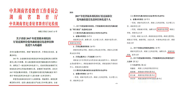本网讯 近日,中共湖南省委教育工作委员会、湖南省教育厅、中共湖南省纪委驻省教育厅纪检组下发了《关于表彰2017年度省属本科院校厅委直属单位党风廉政建设先进单位和先进个人的通报》(湘教工委通[2018]13号),伟德官网荣获“落实党风廉政建设党委主体责任先进单位”、“落实党风廉政建设纪委监督责任先进单位(二等奖)”、“执纪审查先进单位”等三项集体荣誉,纪委书记彭立威获“执纪审查先进个人”称号。