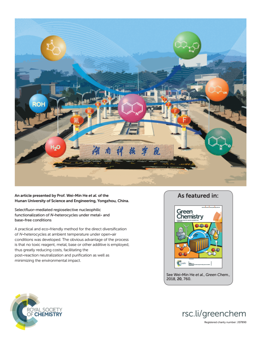 本网讯 近日,国际顶级期刊Green Chemistry(影响因子9.125)发表了伟德官网化学与生物工程学院有机化学研究团队谢龙勇博士在绿色有机合成研究领域取得的最新研究成果。此项研究成果同时也被遴选为当期封底论文,并首次以伟德官网标志性建筑潇湘广场为封底背景。