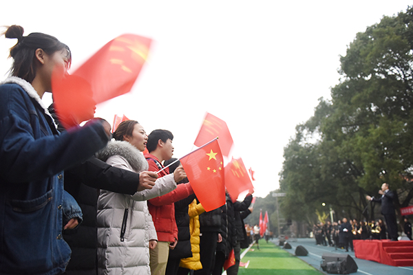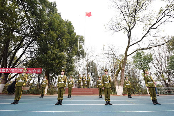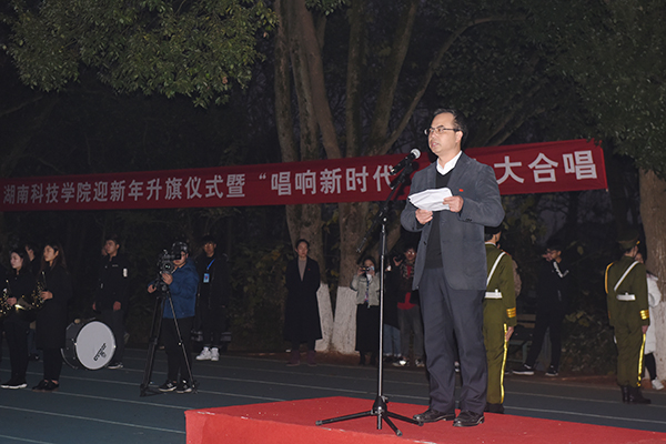 陈弘在国旗下讲话。他说,今天我们隆重举行升国旗仪式,用万人大合唱的形式共同迎接充满希望的2018年。党的十九大开启了中国特色社会主义新时代,中国共产党正带领着我们走在中华民族全面复兴的胜利之路上,我们正生活在一个前所未有的伟大时代。青年学子应如何用青春书写无愧于时代、无愧于历史的华彩篇章?陈弘提出五点期望:一是要有远大的理想,有信念、有梦想、有奋斗、有奉献的人生才是有意义的人生,心中有阳光脚下有才有力量,我们要以国家富强、人民幸福为己任,投身中国特色社会主义伟大实践,在实践中国梦的伟大实践中创造自己的精彩人生;二是要努力学习、练就过硬的本领,珍惜大学生活,如饥似渴、孜孜不倦地学习,既要注重课堂学习多读有字之书,更要注重社会实践,多读无字之书,注重学习人生经验、社会知识,以浩瀚的胸襟引路;三是要树立正确的人生观、价值观,从现在做起,从自己做起,从日常每一件小事做起,让社会主义核心价值观成为自己一生的基本遵循,成为自己一辈子的处事原则和行为准则;四是要有创新精神,要努力的让创新文化成为校园文化的主流,让创新成为青春远航的动力,让创业成为青春搏击的能量;五是要踏踏实实做事、老老实实做人,迈好每一个步伐,夯实每一个根基,永远做一个靠谱的人。陈弘说,同学们就像清晨的太阳,朝气蓬勃、充满希望,大家要永远记住今天这一美好的时刻,不要辜负母校的期待,不要辜负这个伟大时代。