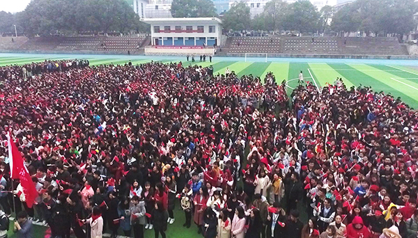 本网讯 “五星红旗迎风飘扬,胜利歌声多么响亮;歌唱我们亲爱的祖国,从今走向繁荣富强……”12月29日早晨7点,一阵阵嘹亮的歌声响彻学校上空,气势恢宏、热情激昂的“万人大合唱”在田径场举行,以迎接新年的到来。党委书记陈弘,校长曾宝成及校领导唐艳明、郑山明、吴小林一同参加。党委副书记唐艳明主持活动。