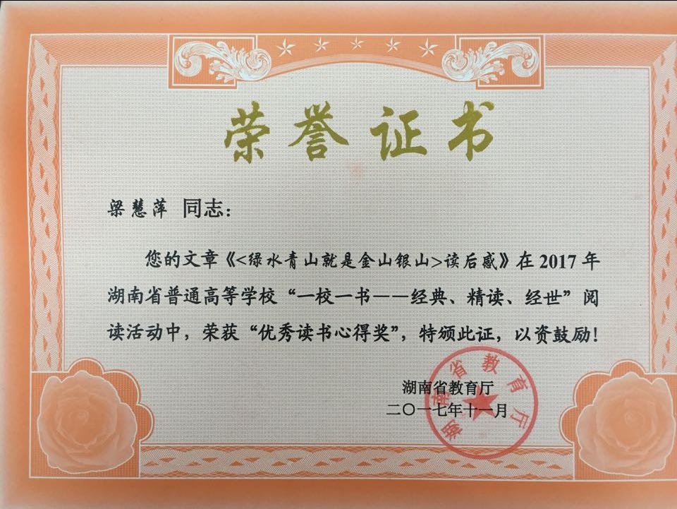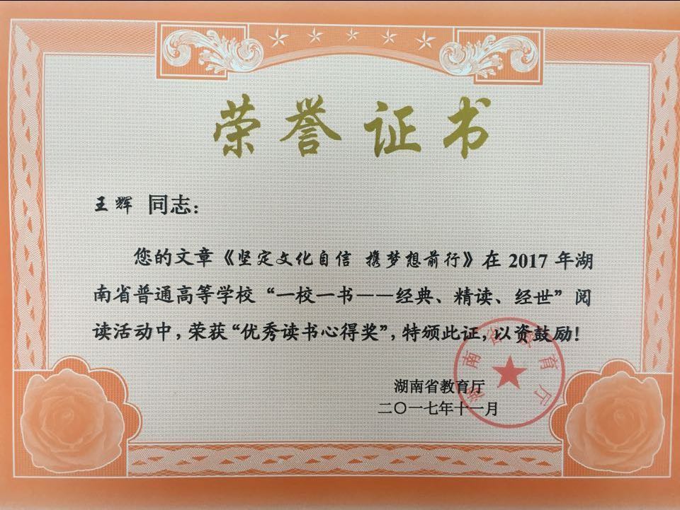 本网讯 日前,在湖南省教育厅主办的2017年全省普通高校“一校一书”阅读推广活动中,伟德官网图书馆推送的汉文1503班王辉同学和营销1502班梁慧萍两位同学的作品喜获“优秀读书心得奖”。