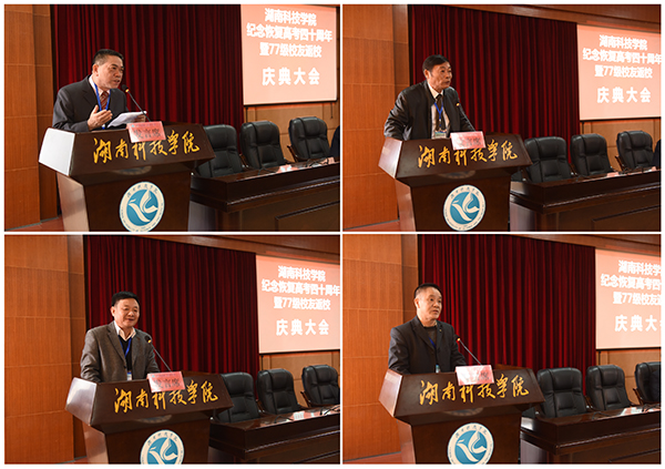 “岁月可使我们老去,但情谊就像老酒越酿越香。”中文科77级校友代表刘海涛在发言中深情回首在母校时,老师和领导们对其无微不至的照顾,使得他跨过艰难险阻,摇身一变成长为广东省级教学名师,他借此机会表达对母校的无限感恩之情。“‘往昔岁月峥嵘稠,忽如白发布满头’。我们虽然已届花甲之年,但仍有‘待到人生得意处,笑看飞鸿枕斜阳’的豪迈襟胸。”物理科77级校友代表史兆宪满怀深情,他衷心祝福母校繁荣昌盛。在教学楼外的挑灯夜读、潇湘边壮志满怀的漫步、如饥似渴的学习场景……数学科77级校友代表肖石明、化学科77级校友代表刘利民讲述母校改变人生的故事,也表达了对母校的深深思念与感激之情。