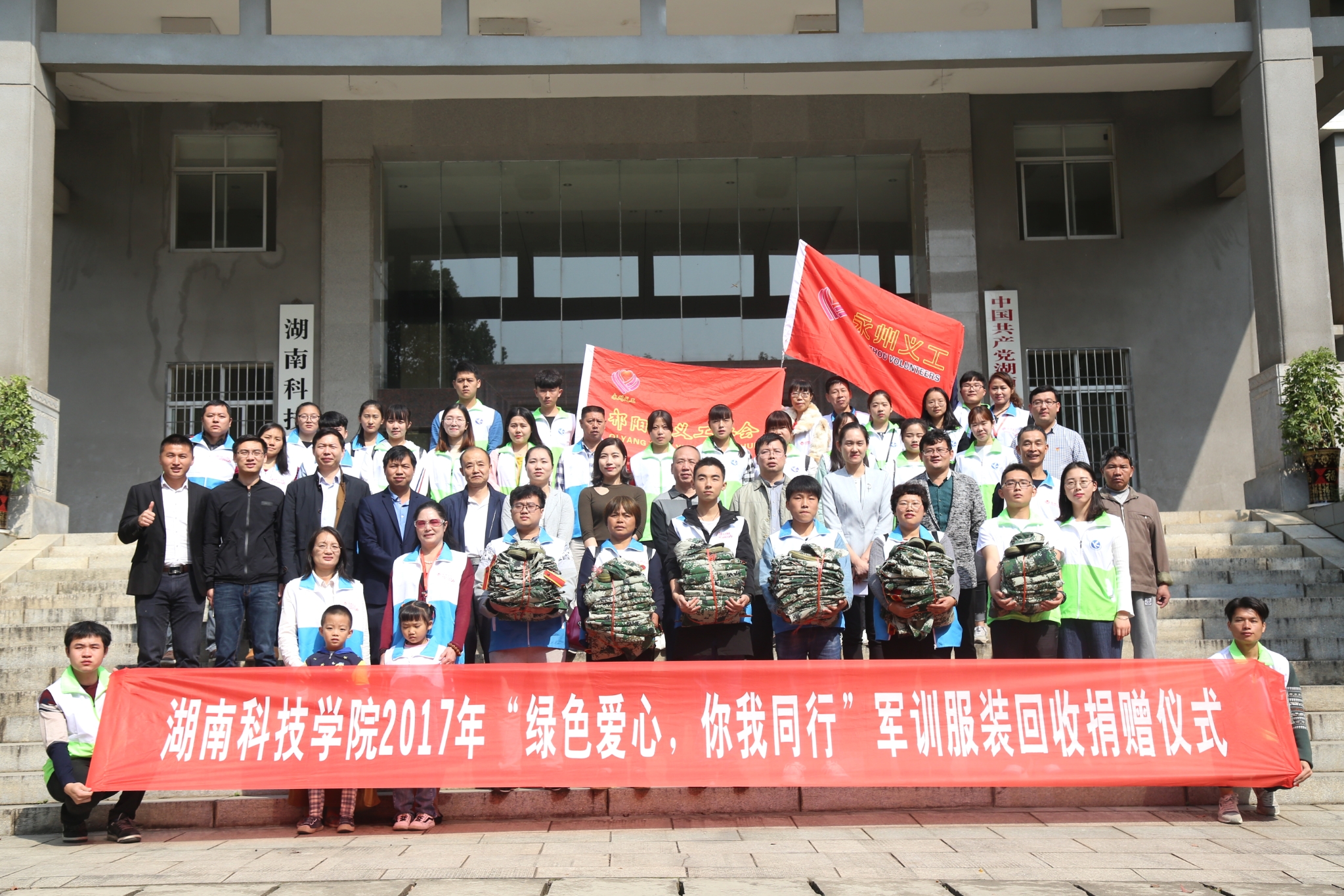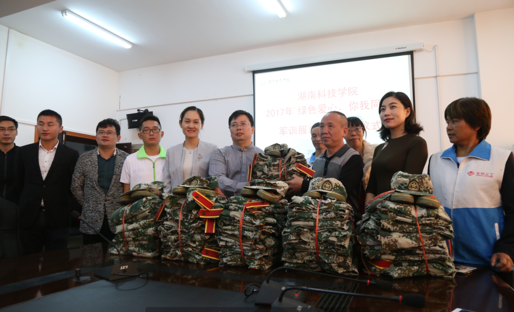 本网讯 10月29日上午,伟德官网举行“绿色爱心,你我同行”军训服装爱心捐赠仪式。永州市文明办副主任周秋平,校团委、理学院等相关负责人参加活动。