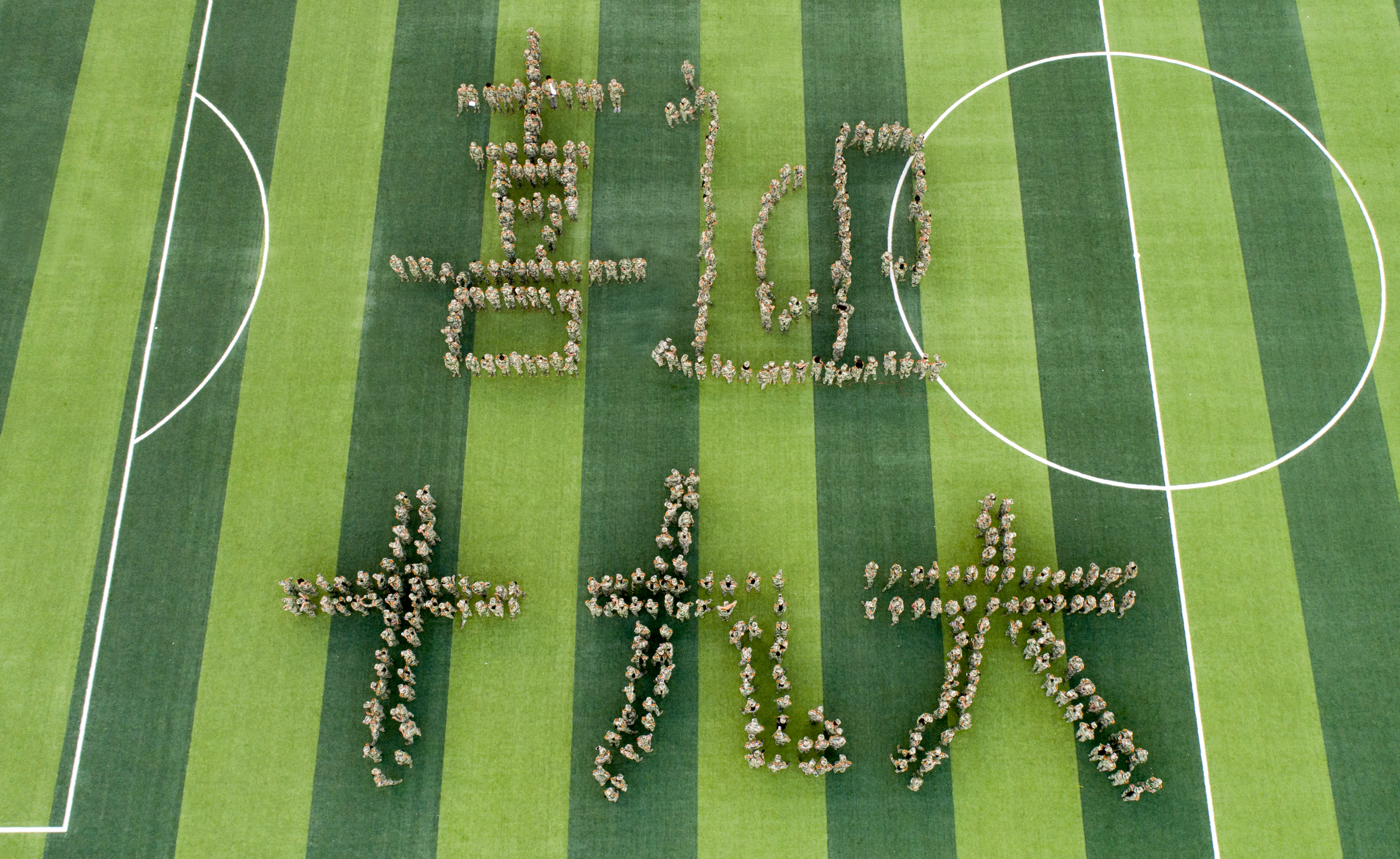 9月29日,学校近600名大一新生在田径场摆出巨型“喜迎十九大”字形,迎接党的十九大胜利召开。