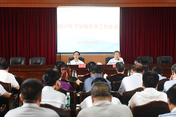 本网讯 9月8日上午,学校召开2017年下学期开学工作会议,回顾总结上半年工作,部署新学期工作。校党委书记陈弘主持会议并强调,全体教职工应当“凝心、聚力、明目、提神”,围绕“坚”、“事”两个关键字下功夫,推进学校事业发展。校长曾宝成要求大家要继续积极推进高水平应用型大学建设,以优异的成绩迎接党的十九大胜利召开。