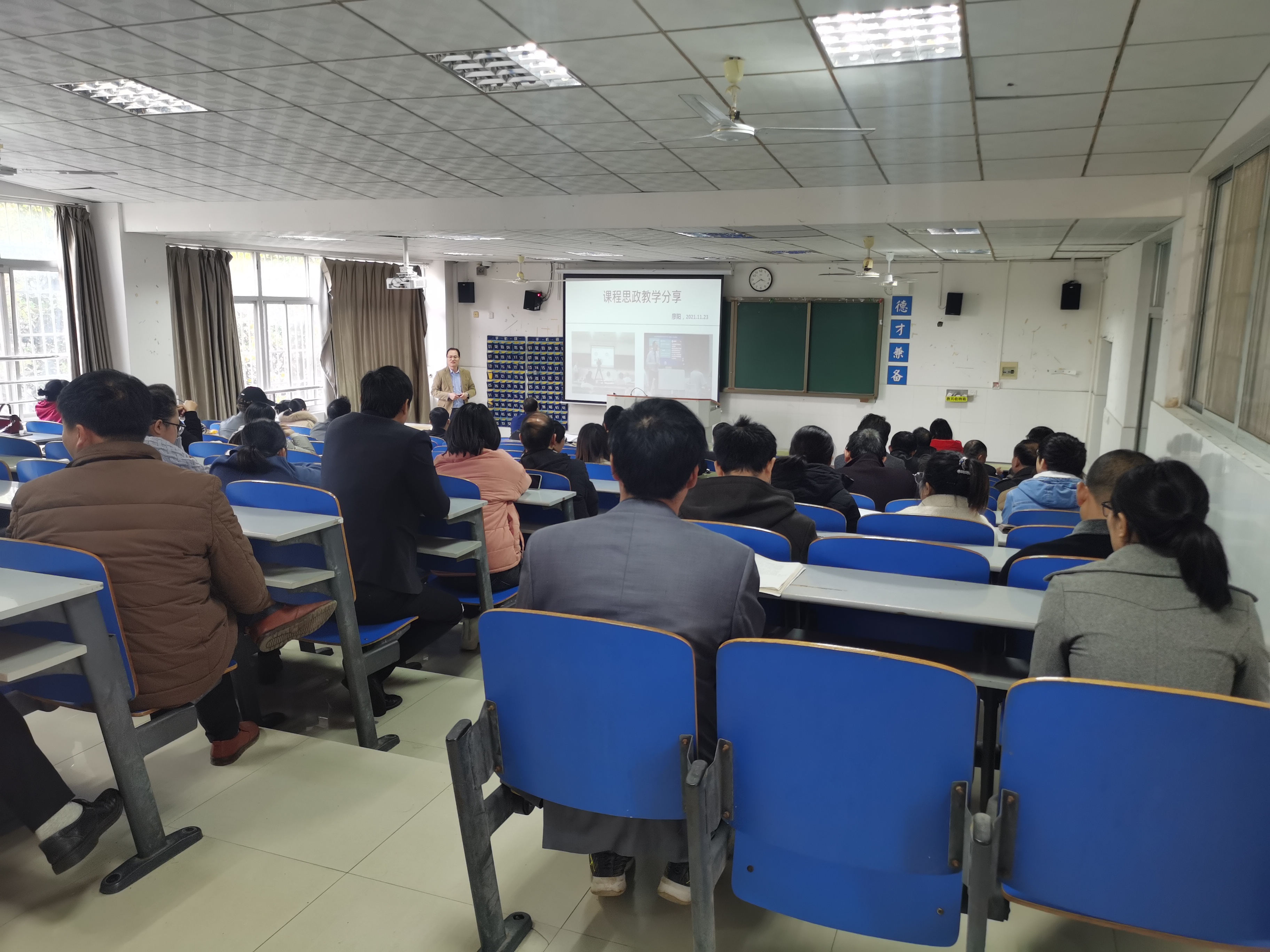 在与学院老师分享课程思政教学经验时,他提到,一是要结合课程自身实际思政育人目标,课程思政不是面面俱到,而是应有自己的侧重点;二是要采用巧妙的方法与策略,不要生硬地灌输和机械地强调,而应该以可以引起学生共鸣的语言、巧妙的活动设计等为载体,教师的个人语言表达方式、风格等也会影响取得的效果;三是要对课程可以融入思政教育的知识点进行梳理,并有意识地积累思政资源,和思考与课程教学结合采取的形式;四是在实际教学中,尤其是课堂师生面对面情况下,融入思政教育时,教师要注意表达方式、情感调动、学生共鸣。