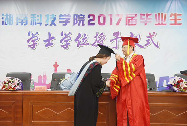 本网讯 微笑、拨穗、正冠、授学位,握手,合影……6月7至8日,学校在潇湘大讲堂举行隆重庄严的学士学位授予仪式,校长曾宝成身穿校长袍,为3000多位毕业生授予学位。