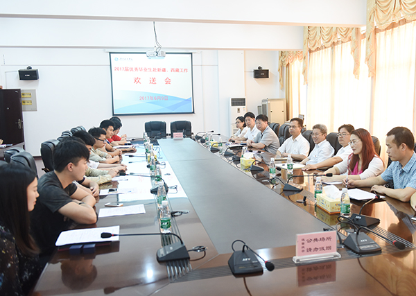 本网讯 6月9日上午,学校在行政办公楼六楼会议室召开2017届优秀毕业生赴新疆、西藏工作欢送会。校党委书记陈弘、校长曾宝成、纪委书记彭立威与即将奔赴新疆、西藏工作的十余位2017届优秀毕业生交流畅谈,送上了诚挚的祝福和嘱托。