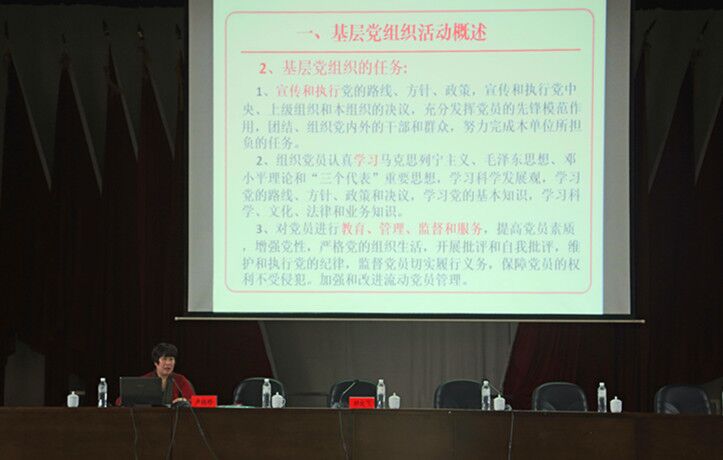 卢桂珍同志从基层党组织活动概述、基层党组织活动类型和基层党组织活动方式三大板块进行讲解。在基层党组织活动概述中,罗列现今党支部、党员作用发挥面临的12个挑战,党组织活动常见的4大问题。在基层党组织活动类型中,对症下药,针对问题展示了党员管理十大新方法、党员教育十大新举措、党内民主与监督十大新探索、党员发挥作用十大新途径和党员联系服务群众十大新方法。