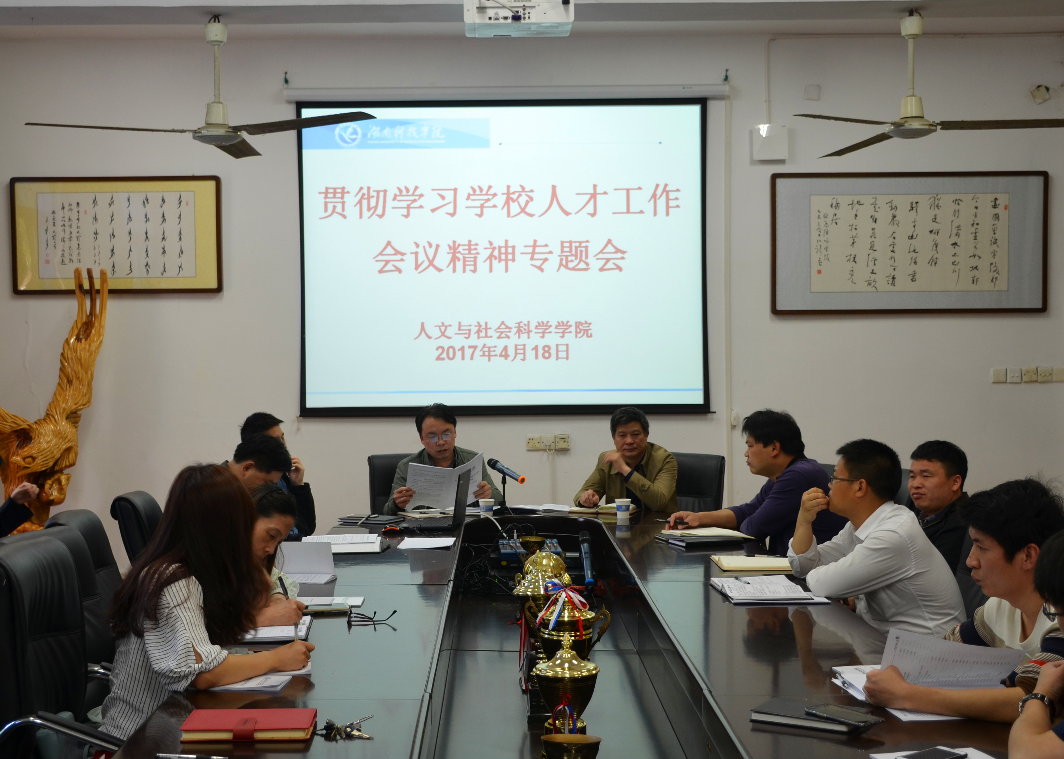 本网讯  为了贯彻落实学校人才工作会议精神,4月18日下午,人文与社会科学学院在明德楼203会议室召开贯彻学校人才工作会议精神专题会。校党委副书记唐艳明应邀到会指导,该院党总支书记谷显明主持会议。