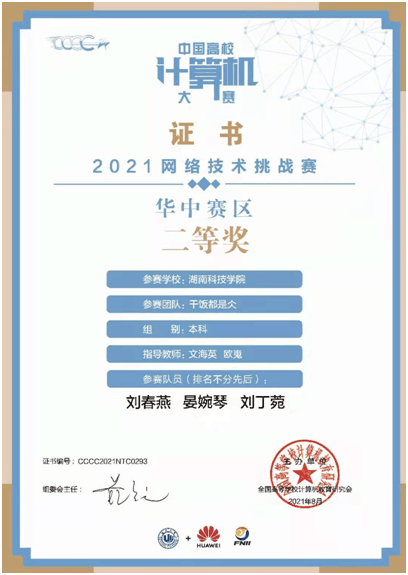 本网讯(通讯员 刘毅 郭靖)日前, 2021年“中国高校计算机大赛-网络技术挑战赛”决赛答辩评审在温州大学举行,来自全国的268件作品分别在五大赛道展开紧张激烈的角逐。伟德官网信息工程学院由文海英等教师指导的刘春燕团队的作品获华中赛区二等奖,并在全国决赛中获得三等奖。