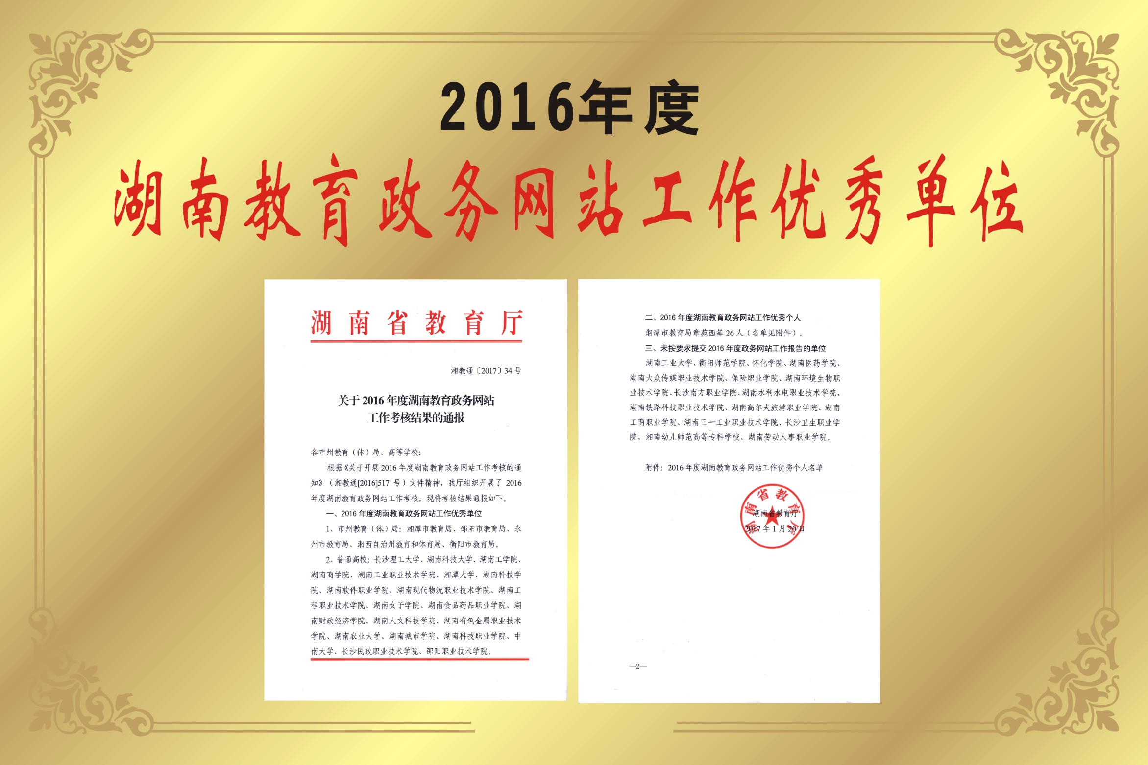 本网讯 近日,湖南省教育厅下发《关于2016年度湖南教育政务网站工作考核结果的通报》(湘教通【2017】34号),伟德官网被授予2016年度“湖南省教育政务网站工作优秀单位”。全省教育系统共有26个单位获此殊荣。李斌获“2016年度湖南教育政务网站工作优秀个人”。