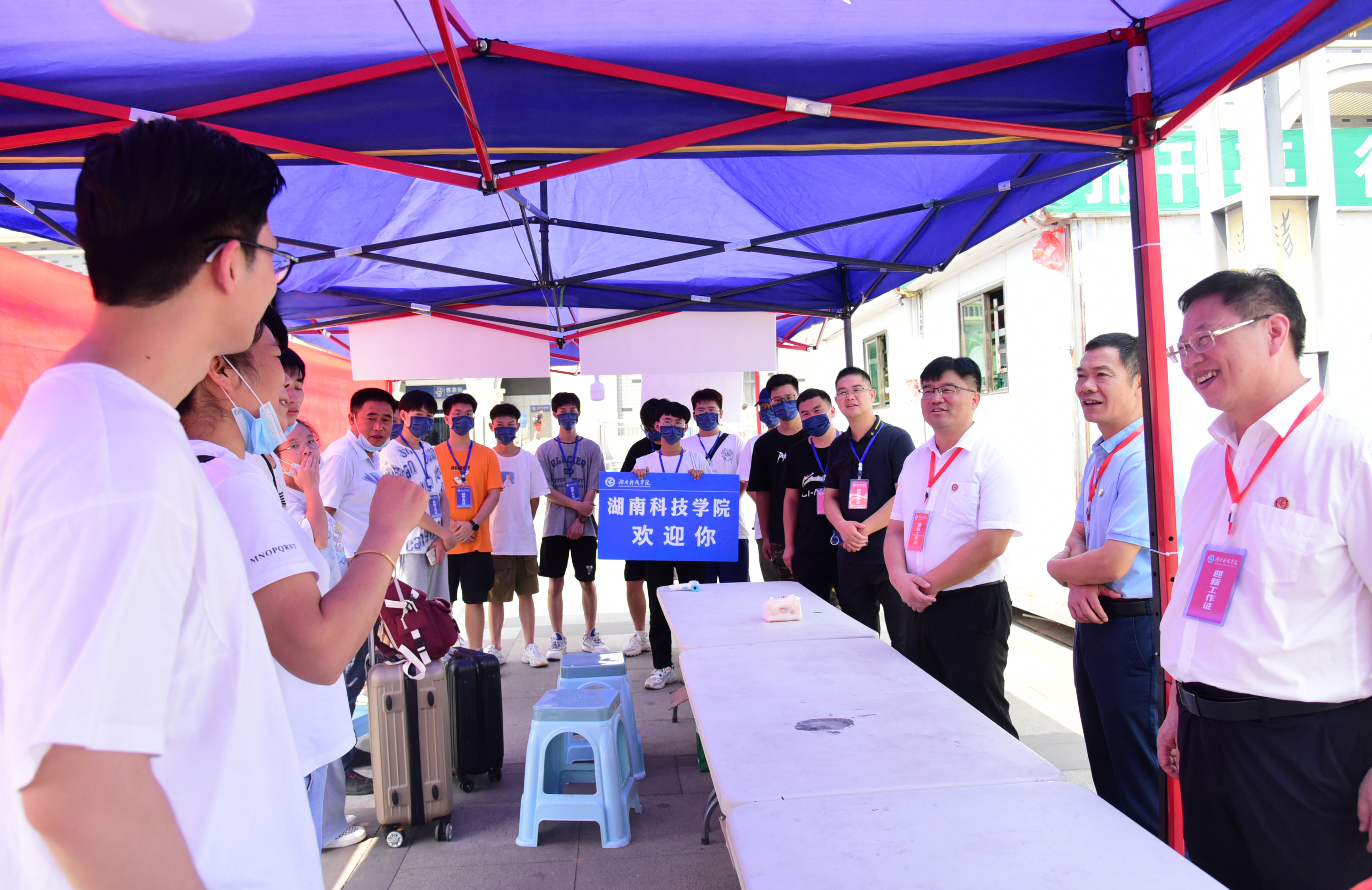 检查走访过程中,校领导先后来到14个教学学院迎新报到处,看望参与迎新工作的师生们,详细询问新生报到情况,了解报到及接待流程,查看迎新工作最新进展。随后,校领导专程前往永州火车站,慰问迎新一线的工作人员,并与新生和家长进行亲切交流,对他们的到来表示热烈欢迎。