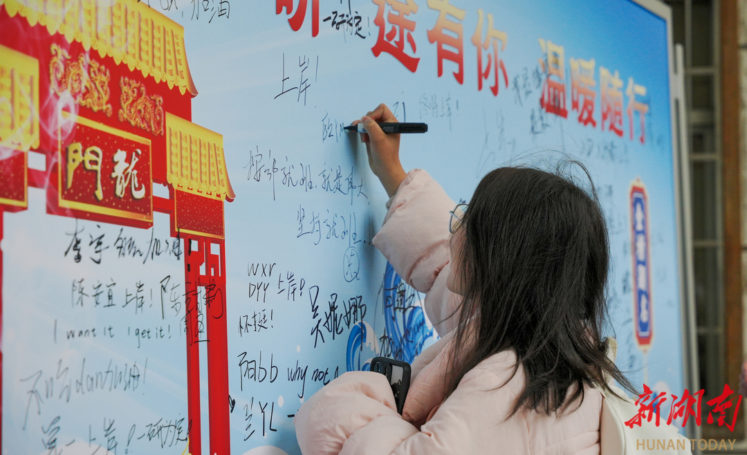 该校图书馆还在一楼大厅设计打造了“祝福锦鲤墙”和“打卡拍照框”,帮助同学们记录美好的备考回忆。同学们纷纷在锦鲤墙留言涂鸦、打卡合影,挥笔豪言壮语为自己加油打气,为考研同伴写下鼓舞的祝福留言。这些“花式宠爱”,让同学们在短暂解压的同时为自己“加油充电”。