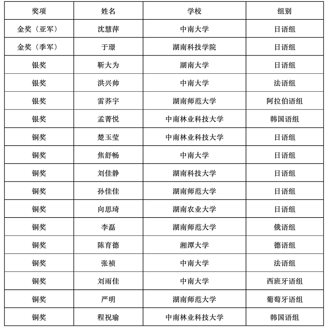 全国大学生外语能力大赛由教育部高教司指导、北京外国语大学主办、外语教学与研究出版社承办。本届大赛设置英语组、多语种组和国际中文组三大组别,覆盖英语、俄语、德语、法语、日语等11个语种,历经校赛、省赛、国赛三个赛段,来自1300多所院校的近70万学生参与,4000人晋级国赛。在一场场激动人心的竞技中,我省百余名国赛选手用外语讲述中国发展变迁,描画湖南风土民情,展现多元文化风采,尽显理解中国、沟通世界的青春力量,搭建交流合作、互学互鉴的友谊桥梁。
