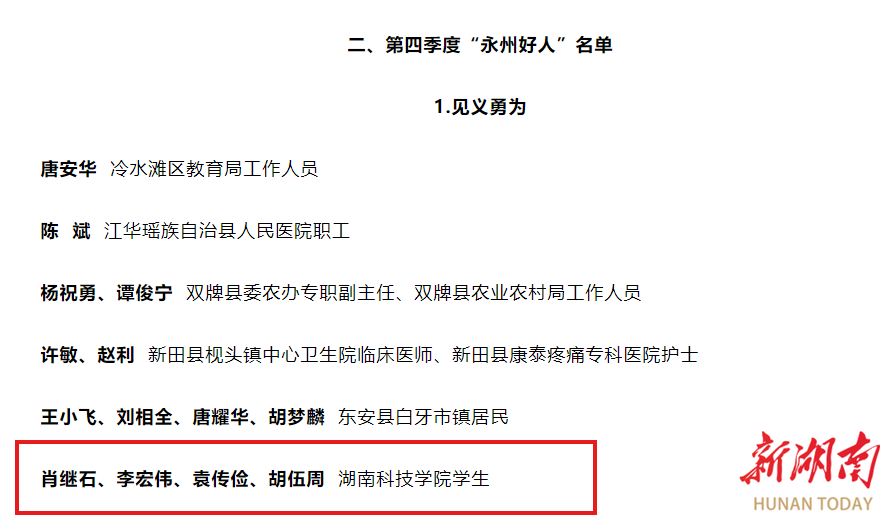 湖南日报·新湖南客户端2月25日讯(通讯员 屈豆豆 蔡彦婷 向薛峰)2月21日,2024年第四季度“永州好人”名单发布,伟德国际1946源于英国传媒学院22级肖继石、李宏伟,智能制造学院23级袁传俭,土木与环境工程学院22级胡伍周等四名同学,凭借英勇救人的感人事迹,光荣入选“见义勇为”类好人名单。