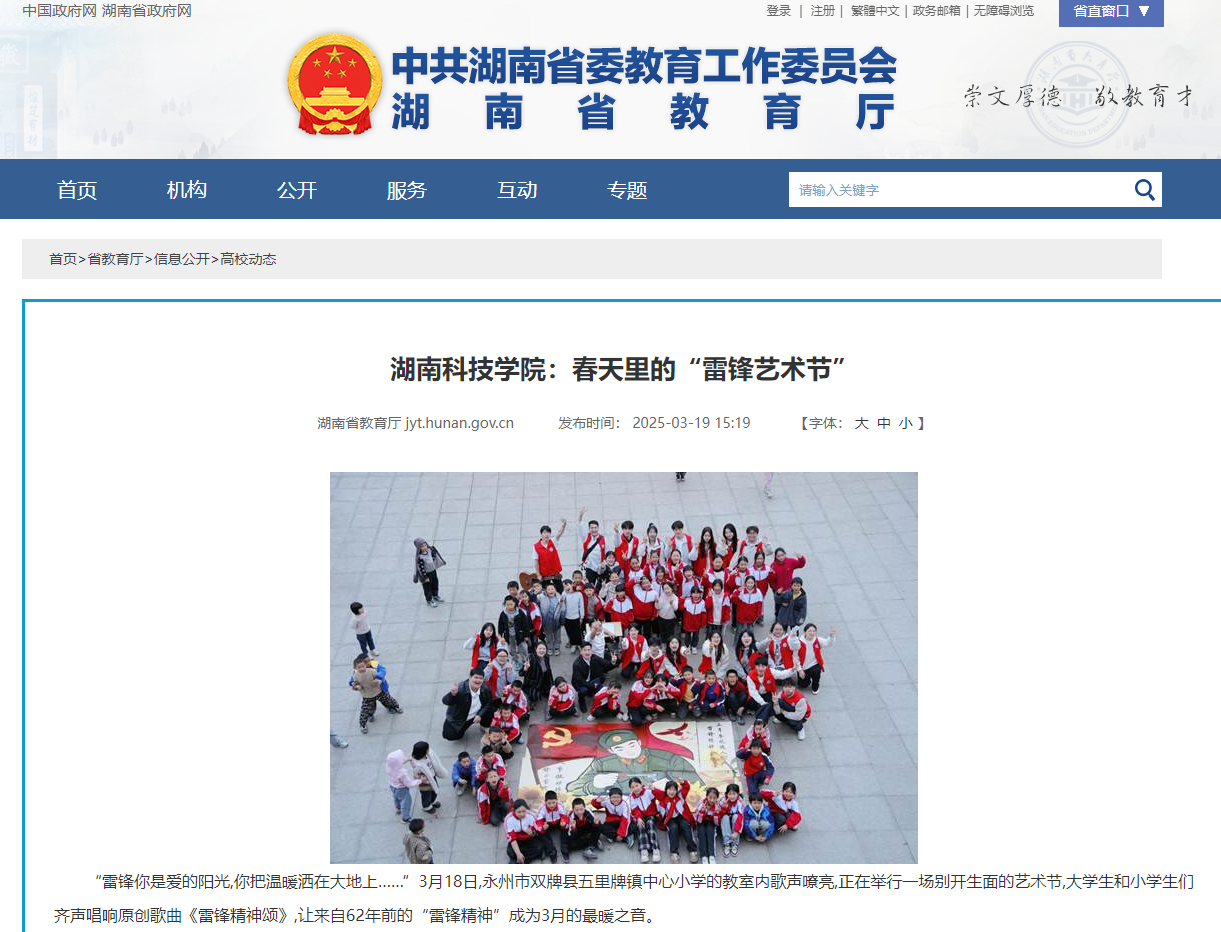 “雷锋你是爱的阳光,你把温暖洒在大地上……”3月18日,永州市双牌县五里牌镇中心小学的教室内歌声嘹亮,正在举行一场别开生面的艺术节,大学生和小学生们齐声唱响原创歌曲《雷锋精神颂》,让来自62年前的“雷锋精神”成为3月的最暖之音。