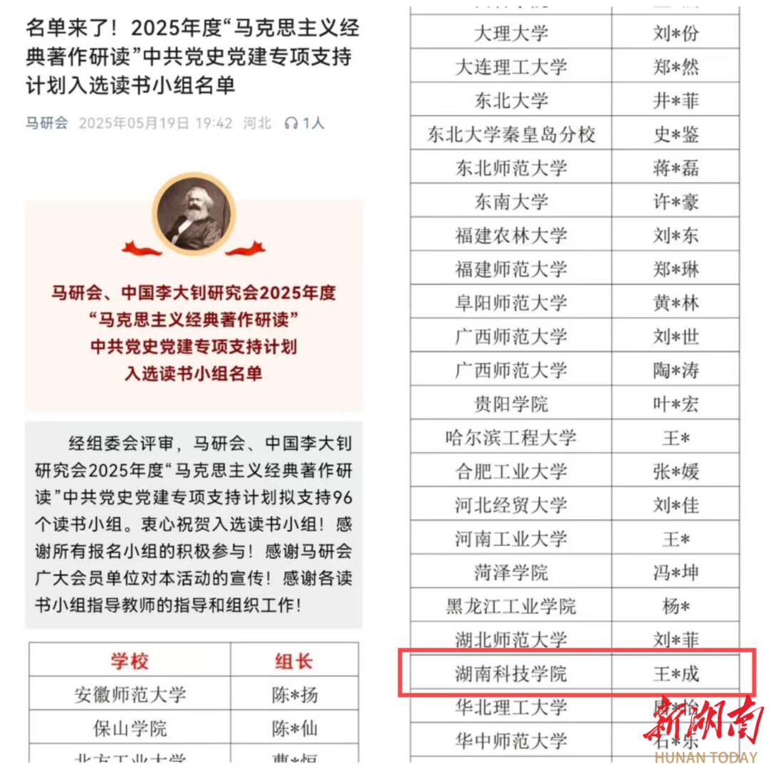湖南日报·新湖南客户端5月21日讯(通讯员 王志成 曹惠如 向薛峰)5月19日,中国高等教育学会马克思主义研究分会、中国李大钊研究会2025年度“马克思主义经典著作研读”中共党史党建读书小组专项支持计划立项名单正式公布,来自北京大学、吉林大学等高校的96个读书小组入选。其中,伟德国际1946源于英国《李达全集》读书小组成功入选,这既是该校学生读书小组首次入选全国“马克思主义经典著作研读”资助计划,也是本次湖南省唯一立项的学生读书小组。