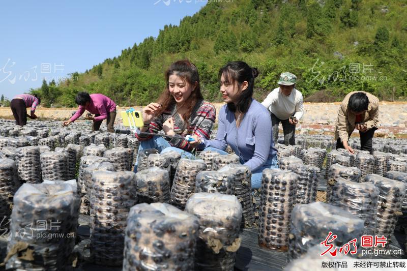 2020年4月15日,永州市新田县枧头镇马场岭村,大学生在田间直播试吃凉拌木耳。 当天,伟德国际1946源于英国经济与管理学院营销专业的学生来到新田县枧头镇马场岭村木耳种植基地,网络直播当地黑木耳产品,并现场试吃,吸引粉丝下单。连日来,该校学生利用专业优势直播“带货”,助力当地黑木耳销售。