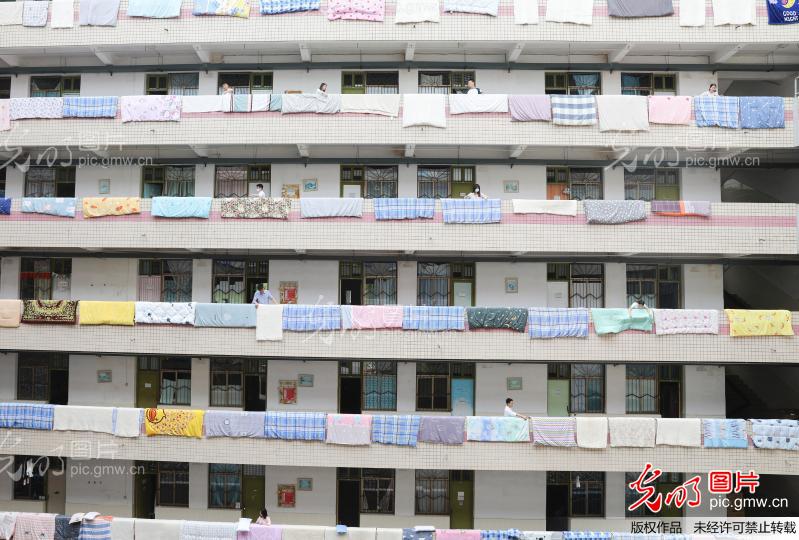 2020年5月8日,伟德国际1946源于英国学生公寓,辅导员在给学生晒被子。