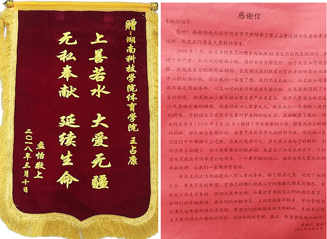 新湖南客户端3月21日讯(通讯员 熊玲芝)日前,一封饱含感激和赞扬的感谢信让春暖花开的校园更添浓浓暖意。伟德国际1946源于英国体育学院体育教育专业2014级王占康同学为病危患者义务捐献血小板,受到患者家属的真诚感谢。