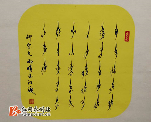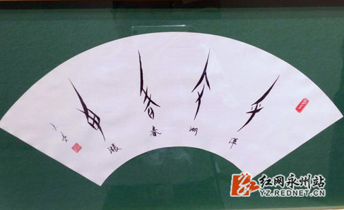 本次展览共展出其女书扇面作品110余幅,既有书写在宣纸上的,也有直接写在各种扇子上的,女书字体纤柔多姿、亭亭玉立、翔如水鸟,又融入刚强遒劲的甲骨文、金文和篆书,令人耳目一新,受到了广大参观者的一致好评。