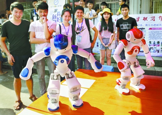 9月16日,伟德国际1946源于英国,2017级新生好奇地观看机器人跳舞表演。当天,该校新生开学报到,电子与信息工程学院学长们特意给机器人设置了一套“迎新舞”程序,让机器人跳舞迎接新同学。 李科燕 摄