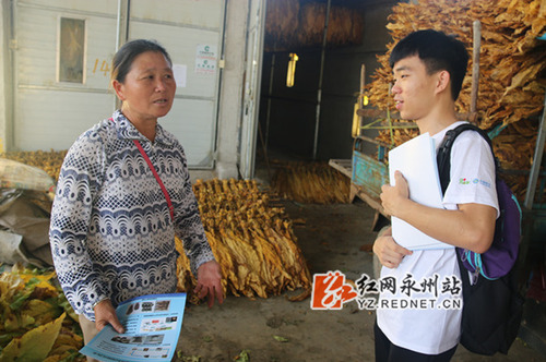 志愿团与烟农深入沟通,为他们讲解烟草种植知识、烟草防病注意事项。
